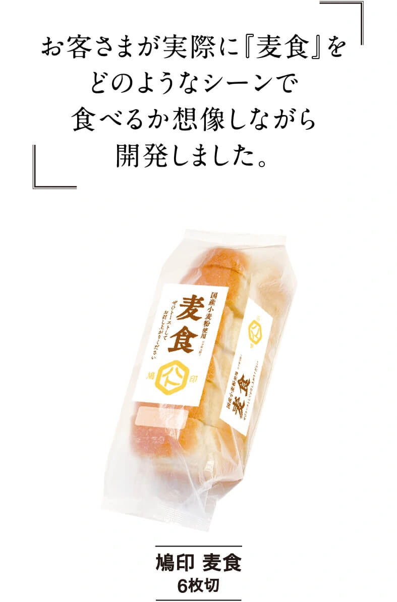 『麦食』という名前には、小麦の味わいをしっかり感じてほしいという想いが込められています。3種類をブレンドした100%の国産小麦粉と『瀬戸のほんじお』を使い、小麦の香りと甘みを素直に引き出す、飽きのこない味わいを実現しました。また、形を山型にしたのにも理由があります。