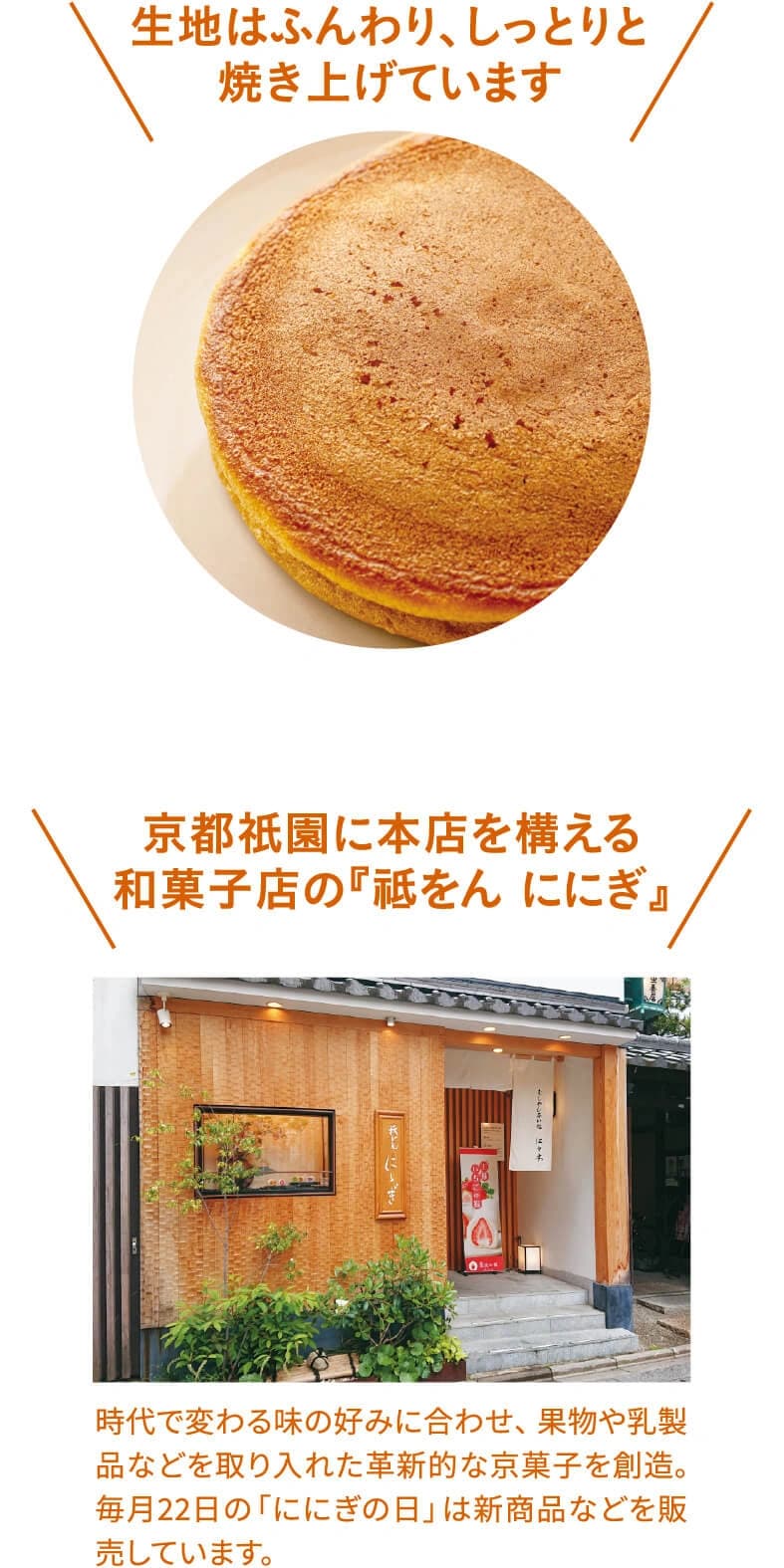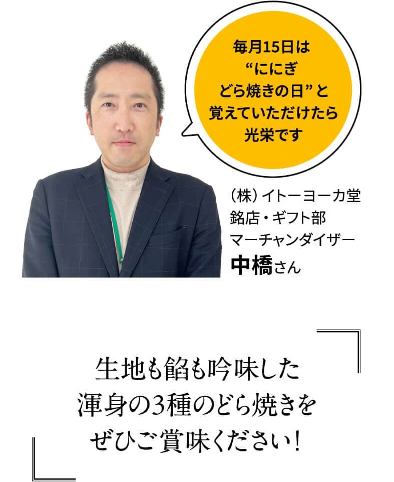 「テレビや雑誌などの和菓子ランキングでいつも上位にあがるどら焼きの新商品の開発を模索していたとき、京都の和菓子店『祇をん ににぎ』の名前が浮かびました。創業して10年余りと比較的新しい店で、フルーツ大福が特に有名です。厳選素材を用いて伝統にとらわれない革新的な商品を作り出すことに定評がある『ににぎ』さんとなら、お客様に喜ばれる新しいどら焼きを生み出せるのではないかと、半ば確信めいた予感がありました」