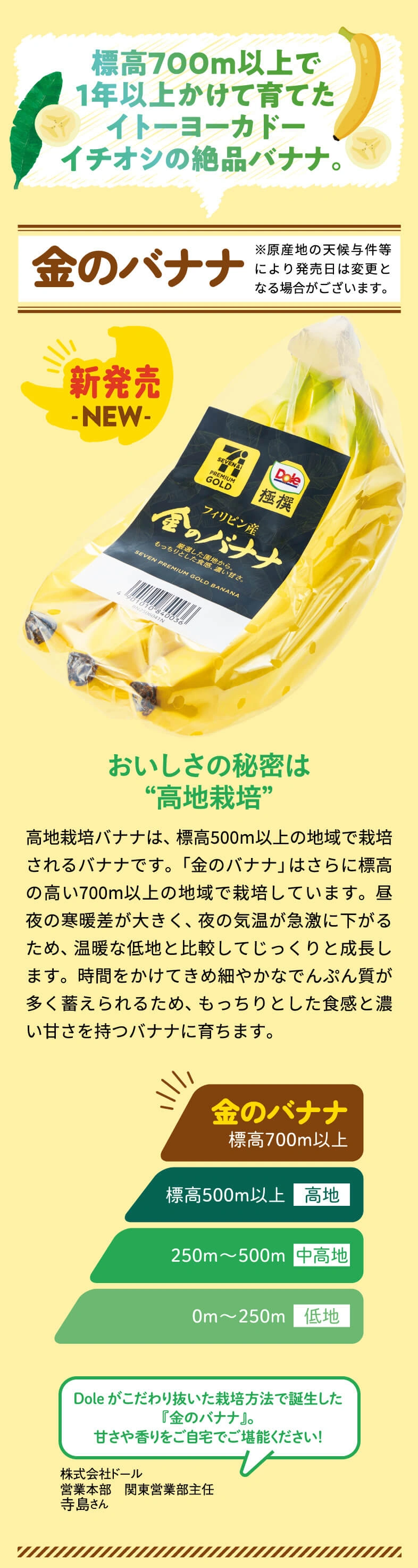 一言でバナナと言っても、スーパーに並ぶ種類はたくさん。そこで、今回はフルーツのプロであるDoleがおすすめするバナナ2種とそのおいしさのワケをご紹介します。とくに、新発売の「金のバナナ」は高地栽培にこだわった逸品です!意外と知らないバナナの正しい保存方法もお見逃しなく。