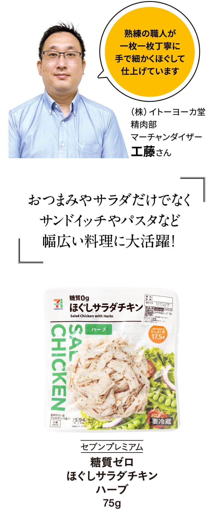 鶏のむね肉を味付けして蒸し上げたサラダチキン。たんぱく質が豊富で、しかもそのまま食べてもサラダにトッピングしてもおいしい。その手軽さと健康志向なところが魅力となり瞬く間にヒット商品となって、さまざまなフレーバーが登場しました。当初はブロックタイプが主流でしたが、 「切るのが手間」「1パックの量が多い」「そのままだと食べにくい」といった声もあり、最近では“ほぐし”や“バータイプ”など、使いやすさ、食べやすさにこだわった商品が人気を集めています。なかでも、イトーヨーカドーが力を注いでいるのがほぐしタイプなのだとか。