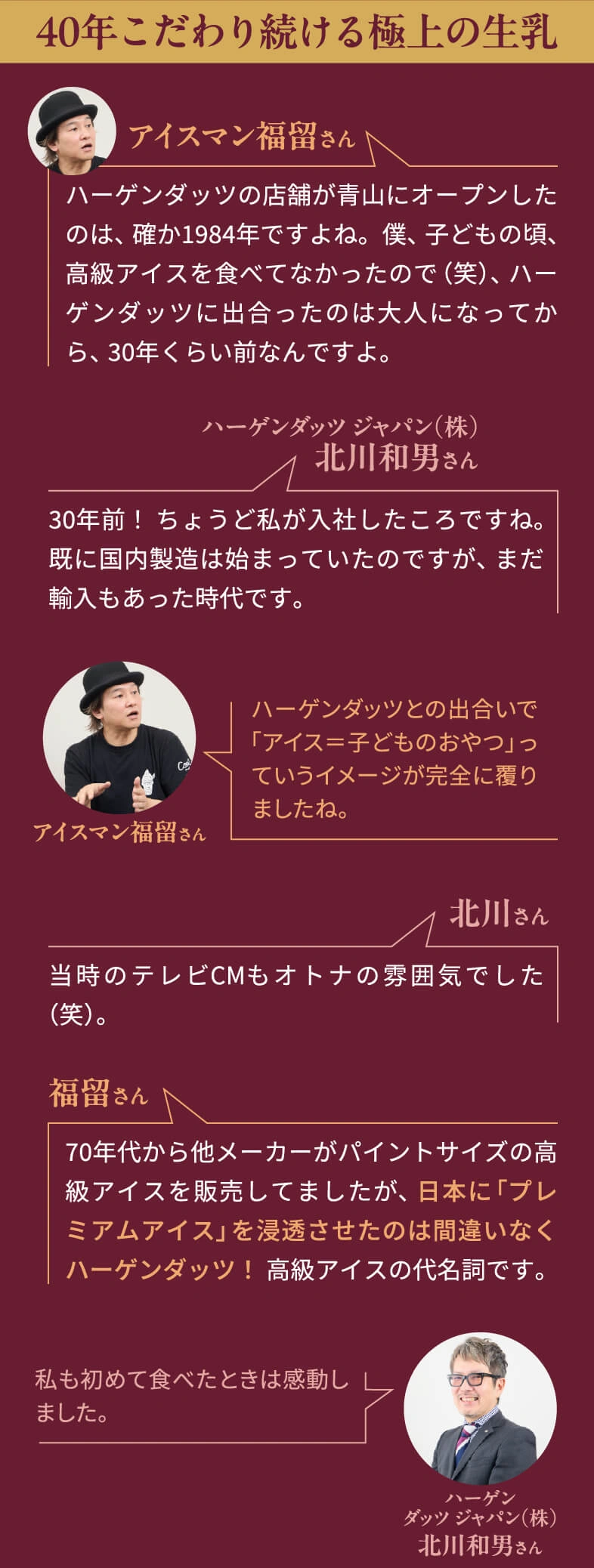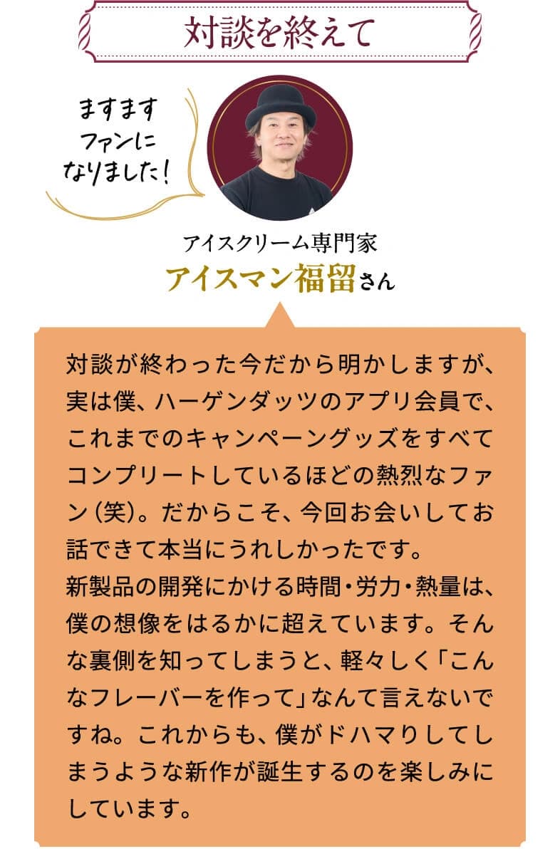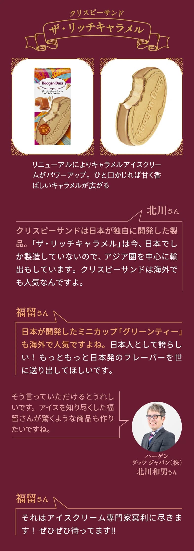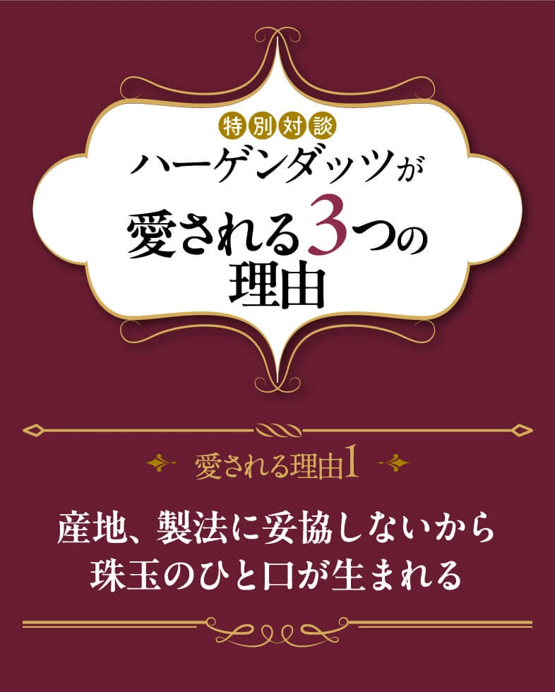 プレミアムアイスのパイオニアとして、40年以上にわたり愛され続けるハーゲンダッツ。そのリッチな味わいはまさに至福のご褒美です。そんなハーゲンダッツのヒミツに迫るべく、日本中のアイスを食べ尽くした専門家・アイスマン福留さんとハーゲンダッツの開発責任者である北川さんによるスペシャル対談が実現!食べるプロと作るプロだからこそ語れる!「おいしさの裏側」とは?