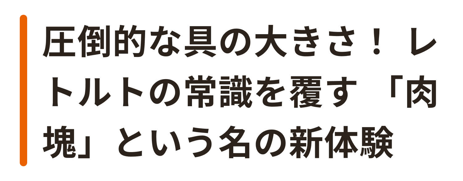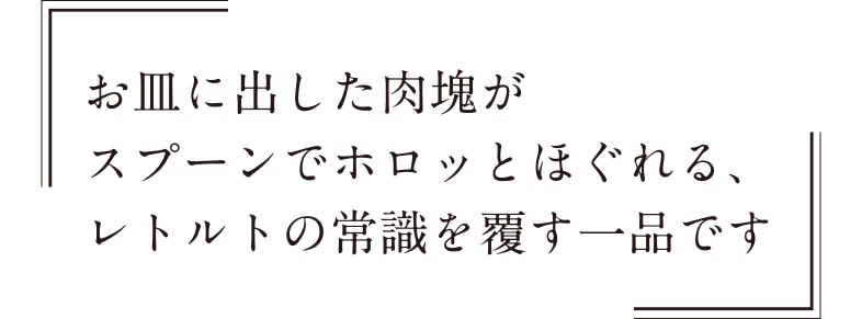 「ただ大きいだけでは意味がありません。スプーンでほぐれる柔らかさを実現しつつ、袋から出すときには“肉塊”としての形を留めていなければならない。この矛盾する課題を解決するために、パートナーとして選んだのが伊藤ハムさんでした。同社が長年培ってきたノウハウと加熱技術があったからこそ実現できた品質です」