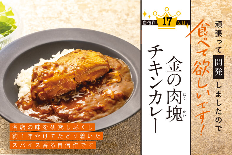 開発者自身が、完成品をお皿にあけた瞬間に思わず「でか!」と声を上げてしまったという自信作。ガッツリ食べたい方はもちろん、具材の満足感を求める方にもおすすめのチキンカレーです。
