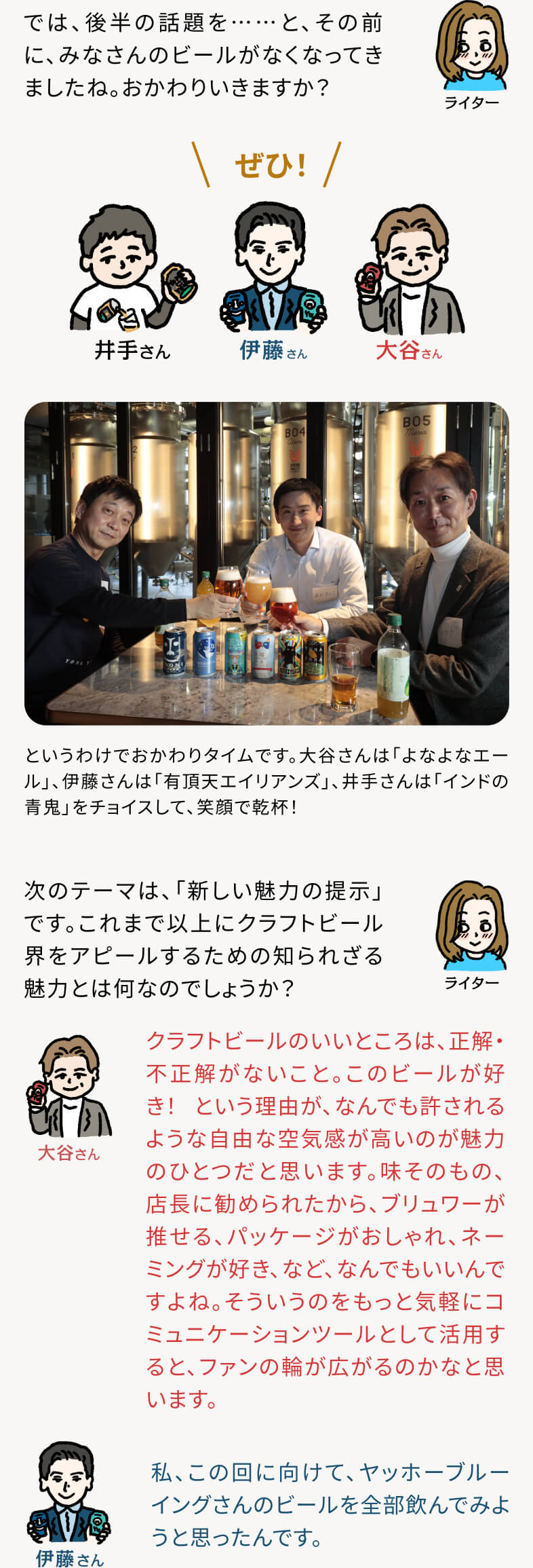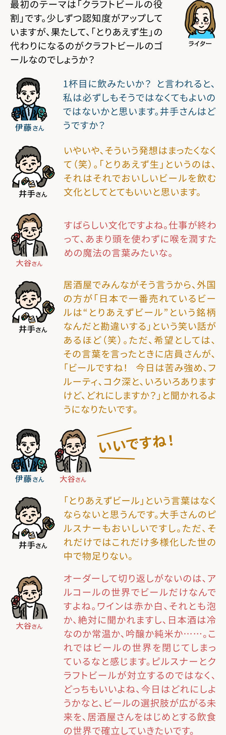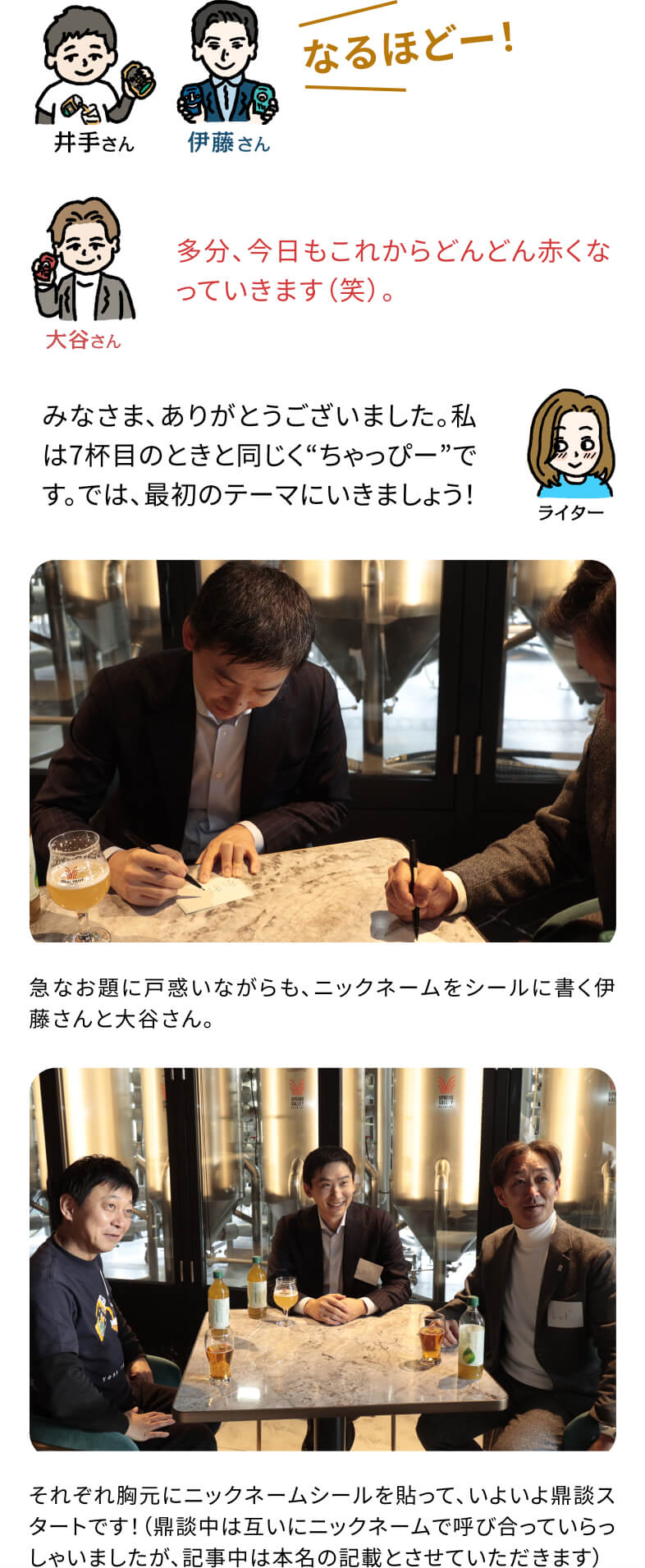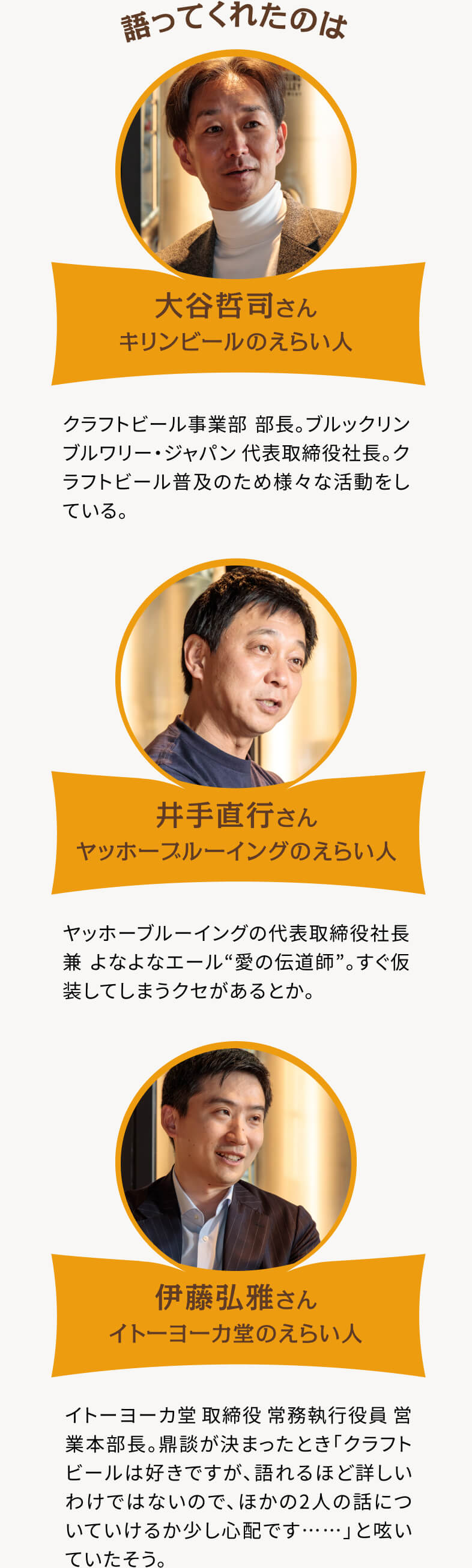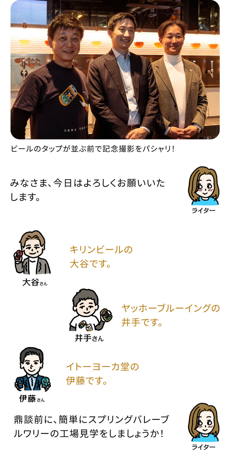 みなさん、こんにちは。私は、お酒は大好きだけど、ビールはまったく初心者のライターです。これまでクラフトビールの基本や楽しみ方、作り方などを少しずつ学んできましたが、今回はなんと、業界の“えらい人たち”にお話を伺えるビッグチャンスが到来! お集まりいただいたのは、キリンビール、ヤッホーブルーイング、そしてイトーヨーカ堂のえらい人というそうそうたるメンバーです。正直、緊張で心臓がバクバク……。でも、こんな機会はめったにない! 思い切ってクラフトビールについて気になっていたあれこれを、ストレートにぶつけてみました。するとみなさん、静かな熱量をもって、でも、初心者の私にもわかるようやさしく語ってくださって感激! クラフトビールのそもそもの役割から、どう広げていくか、新たな魅力の提案、そして3人が想う夢の話まで――。ちょっと特別、かつクラフトビールがこれまで以上にぐっと身近に感じられる、ステキなお話がたっぷり聞けました。“えらい人たち”が語るクラフトビールのこれから、ぜひ最後までお楽しみください!