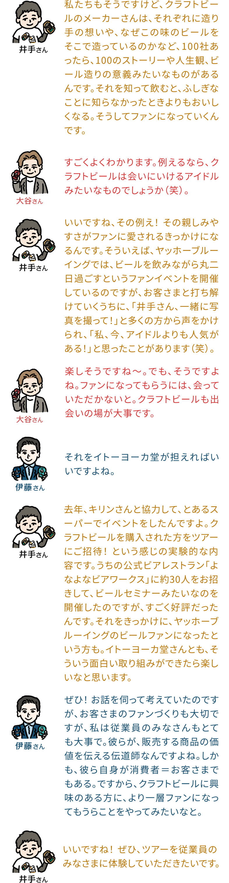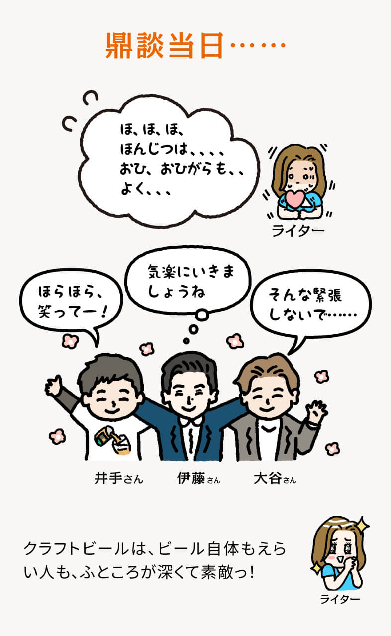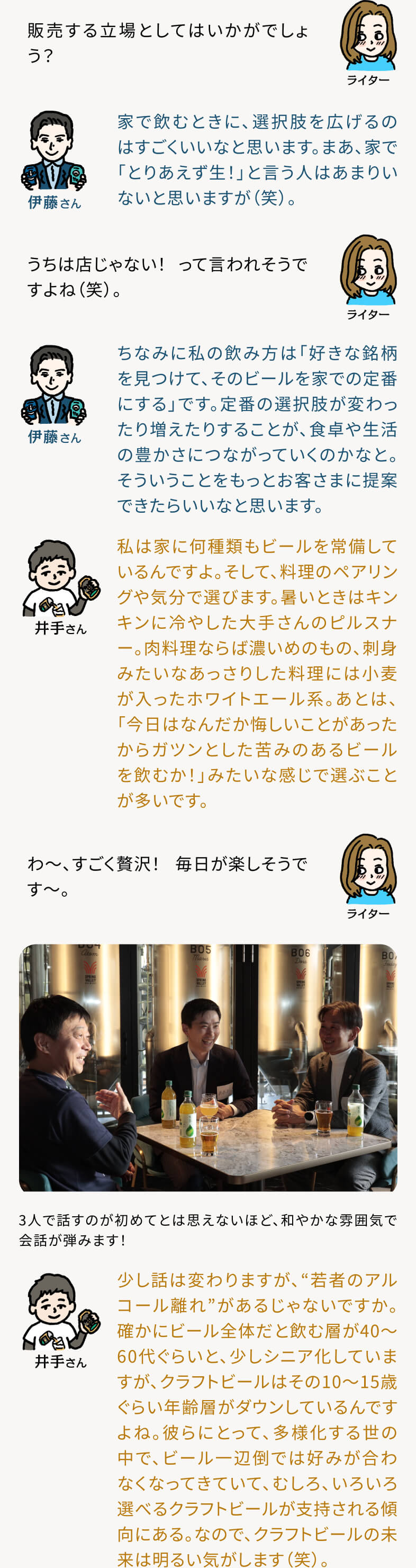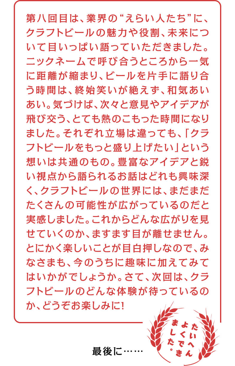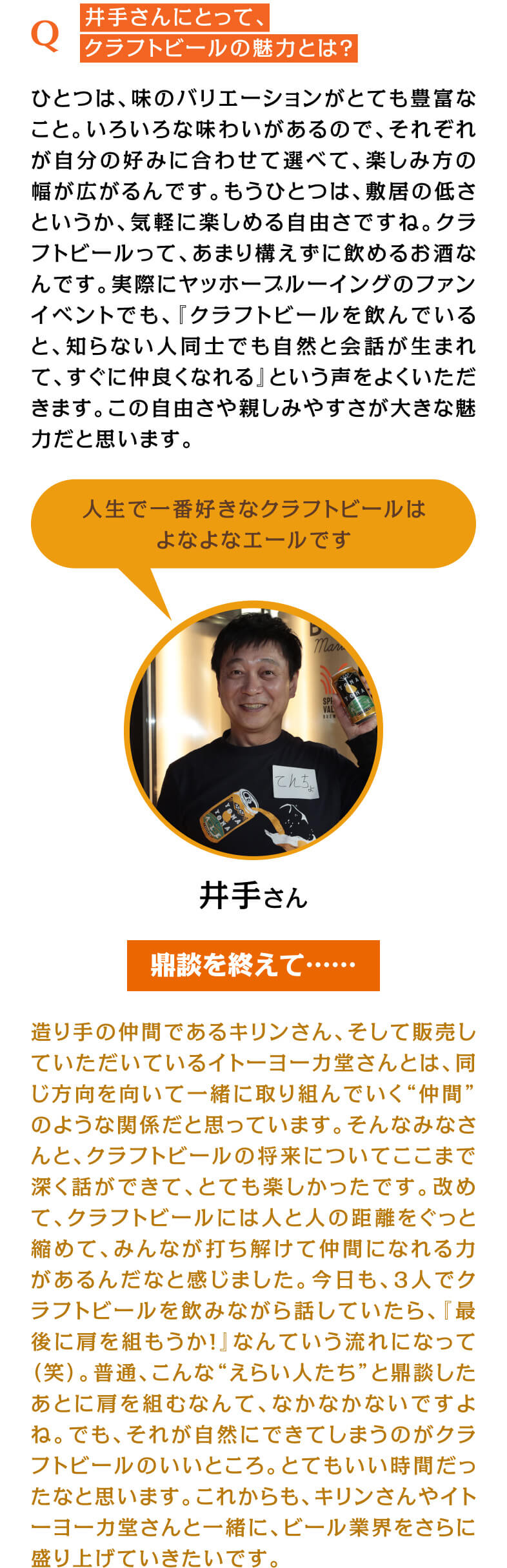 みなさん、こんにちは。私は、お酒は大好きだけど、ビールはまったく初心者のライターです。これまでクラフトビールの基本や楽しみ方、作り方などを少しずつ学んできましたが、今回はなんと、業界の“えらい人たち”にお話を伺えるビッグチャンスが到来! お集まりいただいたのは、キリンビール、ヤッホーブルーイング、そしてイトーヨーカ堂のえらい人というそうそうたるメンバーです。正直、緊張で心臓がバクバク……。でも、こんな機会はめったにない! 思い切ってクラフトビールについて気になっていたあれこれを、ストレートにぶつけてみました。するとみなさん、静かな熱量をもって、でも、初心者の私にもわかるようやさしく語ってくださって感激! クラフトビールのそもそもの役割から、どう広げていくか、新たな魅力の提案、そして3人が想う夢の話まで――。ちょっと特別、かつクラフトビールがこれまで以上にぐっと身近に感じられる、ステキなお話がたっぷり聞けました。“えらい人たち”が語るクラフトビールのこれから、ぜひ最後までお楽しみください!