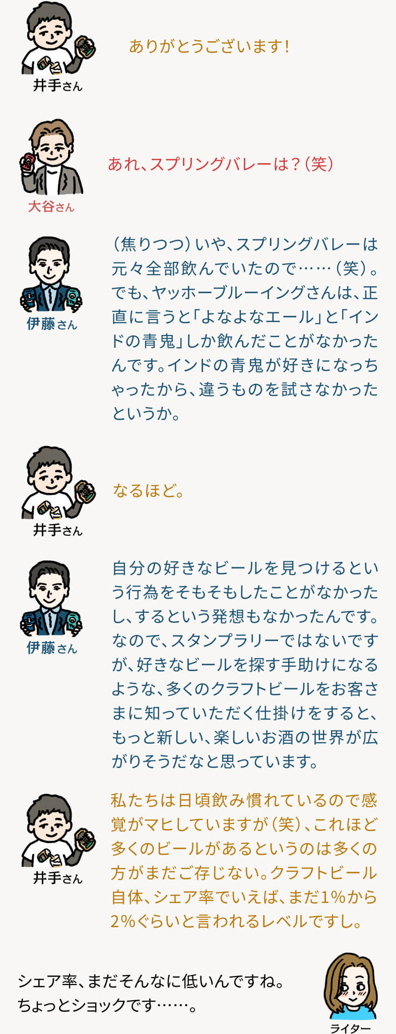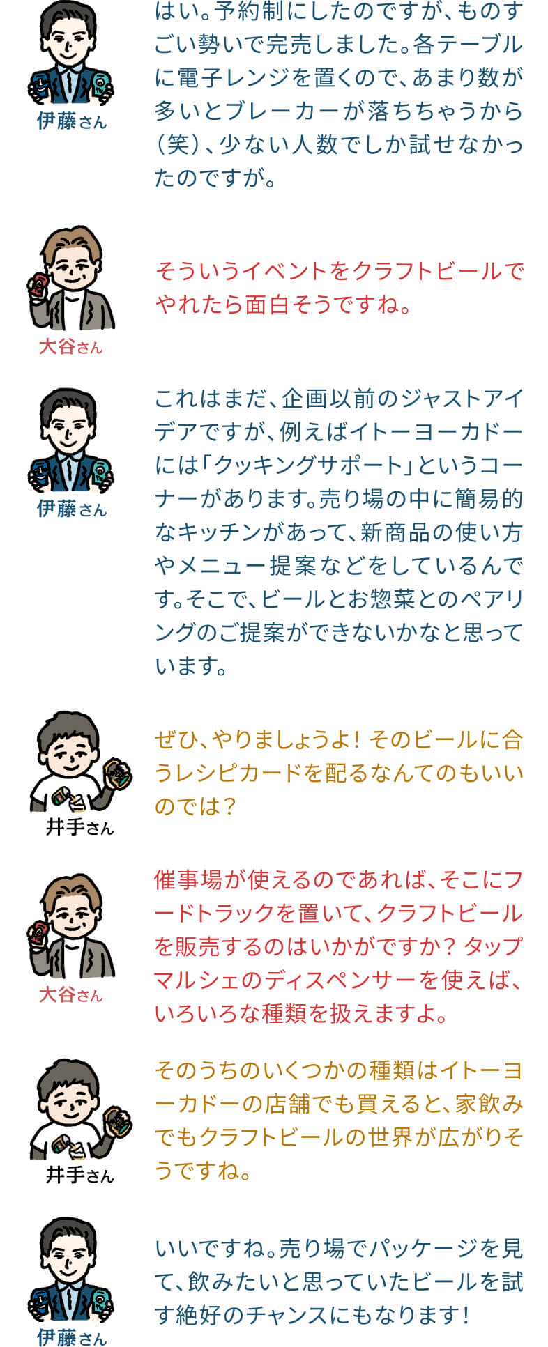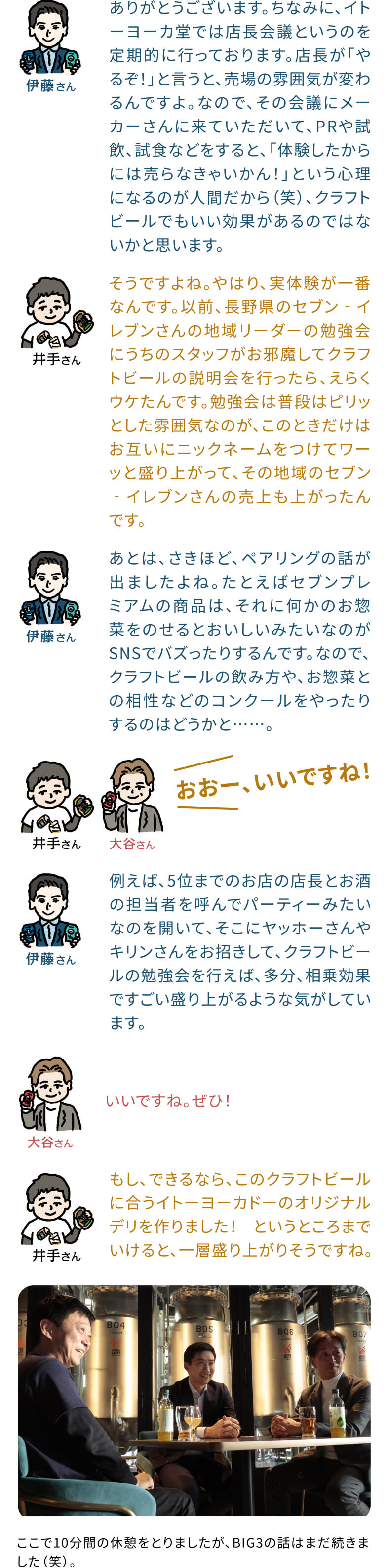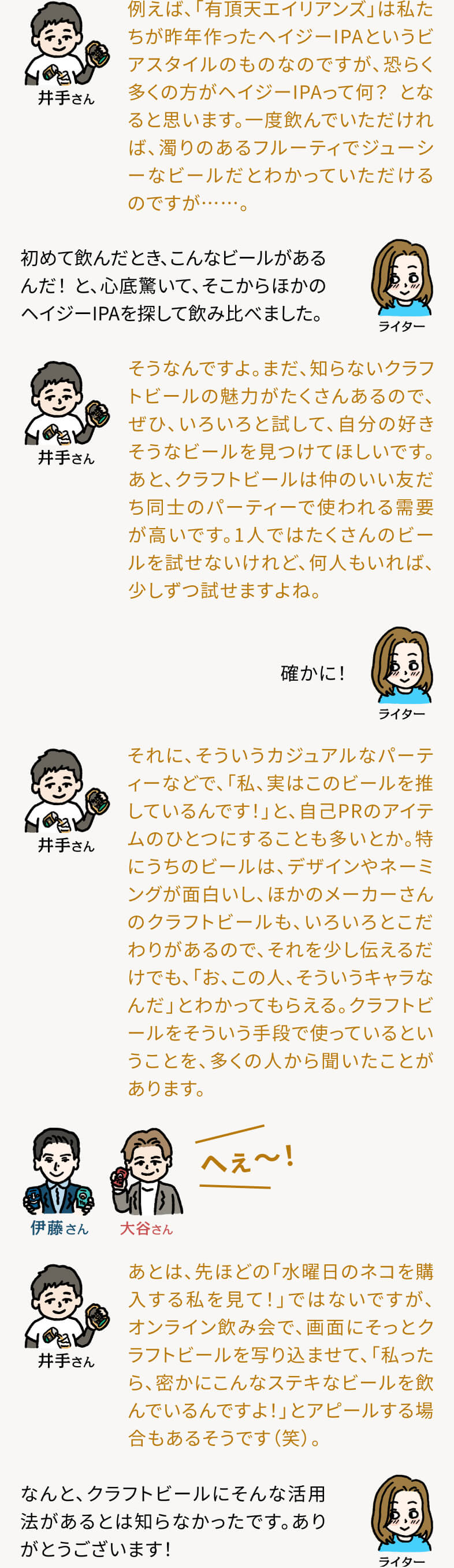 みなさん、こんにちは。私は、お酒は大好きだけど、ビールはまったく初心者のライターです。これまでクラフトビールの基本や楽しみ方、作り方などを少しずつ学んできましたが、今回はなんと、業界の“えらい人たち”にお話を伺えるビッグチャンスが到来! お集まりいただいたのは、キリンビール、ヤッホーブルーイング、そしてイトーヨーカ堂のえらい人というそうそうたるメンバーです。正直、緊張で心臓がバクバク……。でも、こんな機会はめったにない! 思い切ってクラフトビールについて気になっていたあれこれを、ストレートにぶつけてみました。するとみなさん、静かな熱量をもって、でも、初心者の私にもわかるようやさしく語ってくださって感激! クラフトビールのそもそもの役割から、どう広げていくか、新たな魅力の提案、そして3人が想う夢の話まで――。ちょっと特別、かつクラフトビールがこれまで以上にぐっと身近に感じられる、ステキなお話がたっぷり聞けました。“えらい人たち”が語るクラフトビールのこれから、ぜひ最後までお楽しみください!
