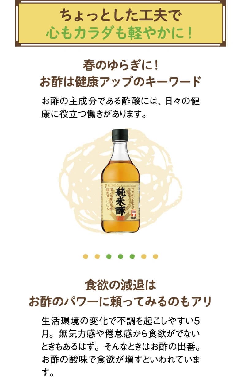 外はぽかぽか陽気なのに、どうしてもやる気がでない日ってありますよね。そんなときは、元気につながるお酢に注目!食欲がなくても自然と箸がすすむさっぱりごはんレシピをご紹介します。