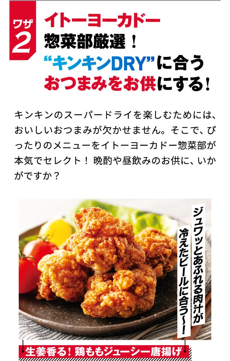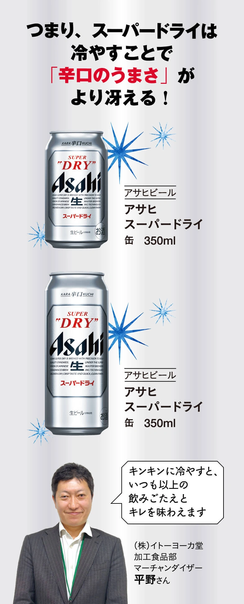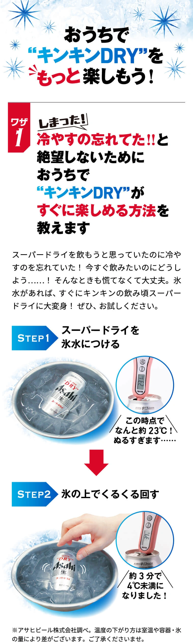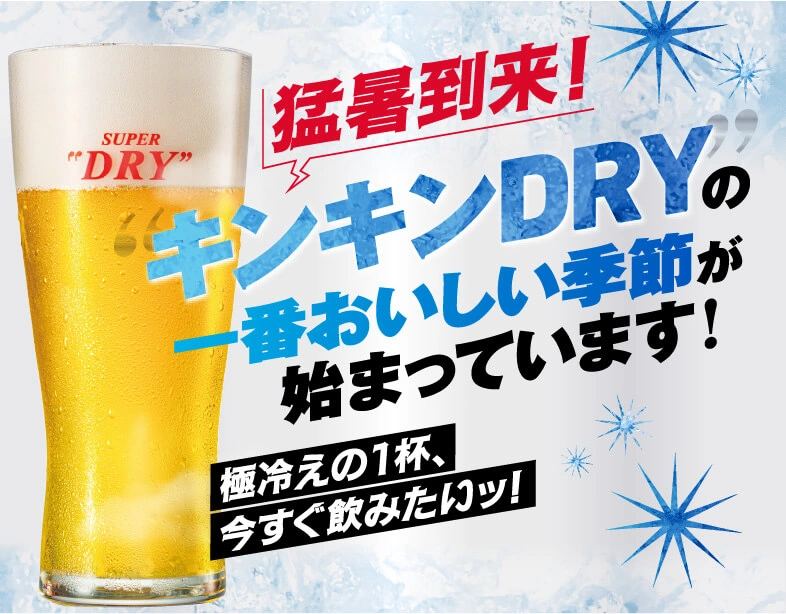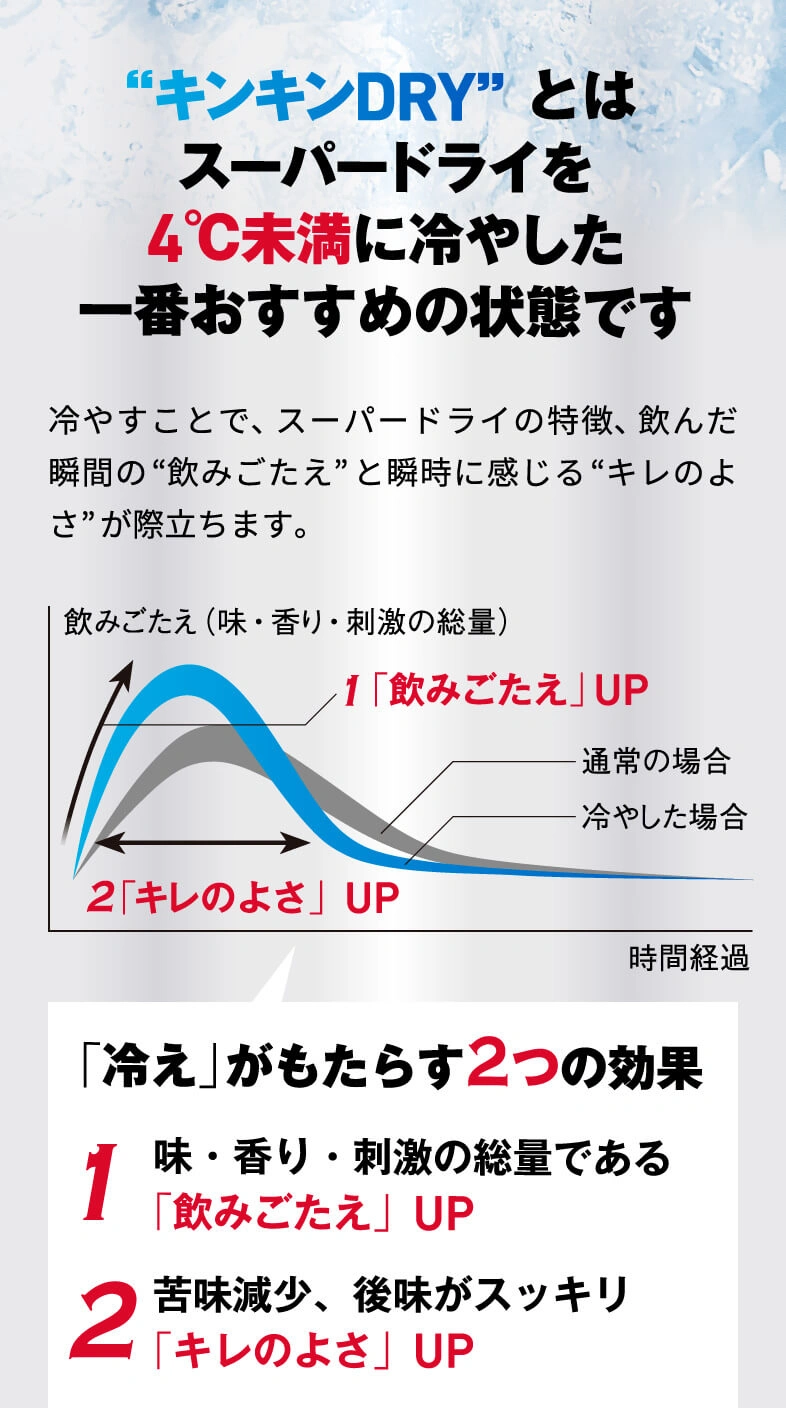 真の実力を発揮するカギを握るのはズバリ“冷え”。キンキンに冷やすことで“辛口のうまさ”がより冴えわたるおいしいスーパードライを思う存分楽しもう!