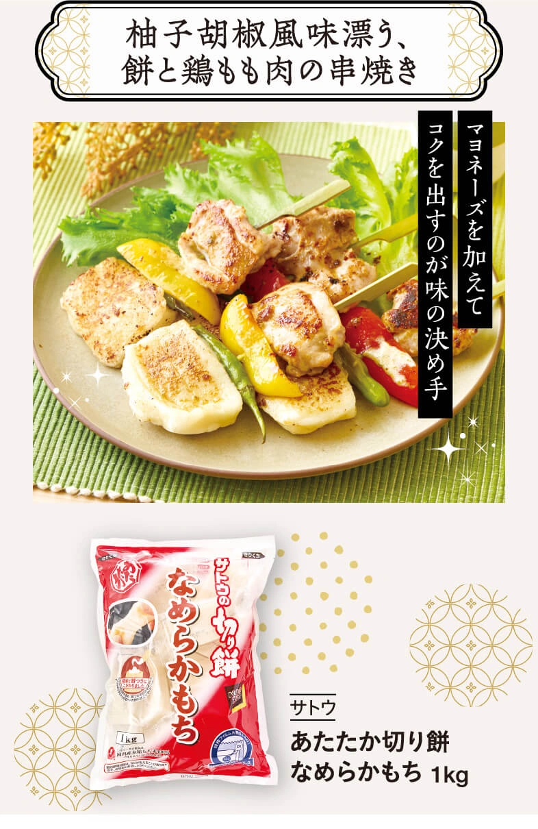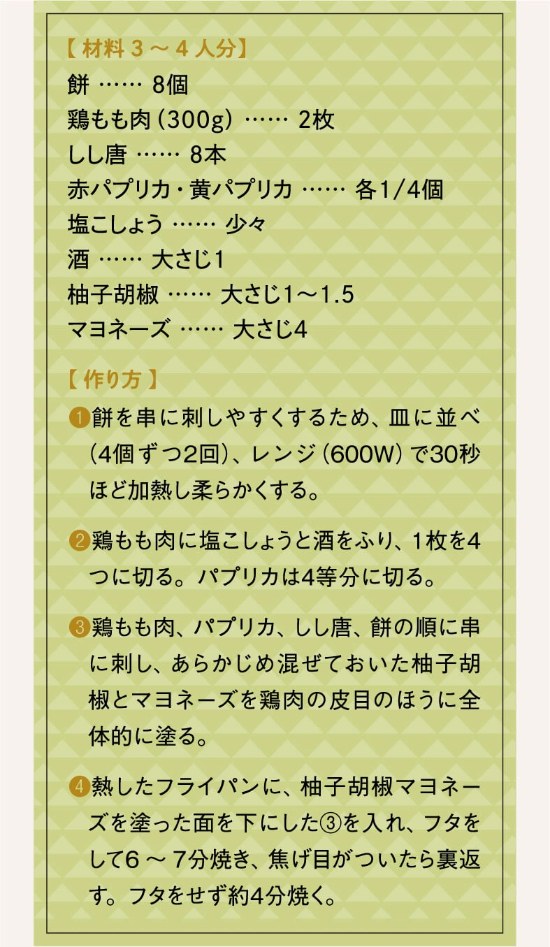 年末年始に大活躍の餅を、串焼きに大胆アレンジ。ちょい辛の柚子胡椒が具材たちをまとめて感動もののおいしさ!