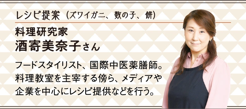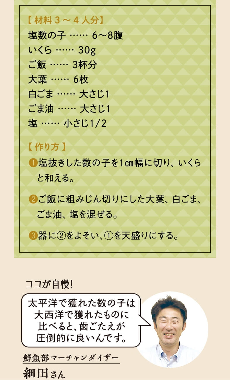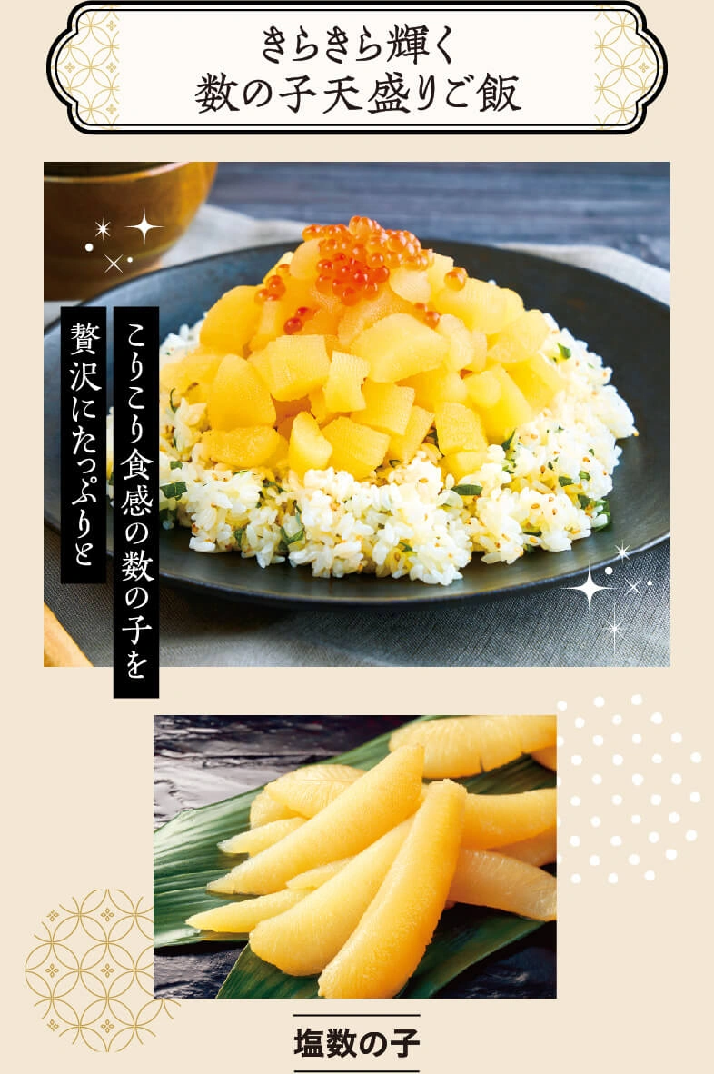 アラスカやロシアで水揚げされたニシンの魚卵を加工した、歯ごたえの良い数の子を、大葉とごま入りご飯の上に豪快に盛り付けました。まずは“黄色いダイヤ”の美しい見た目と香りを楽しんで。