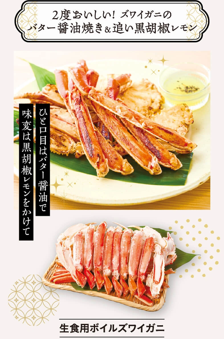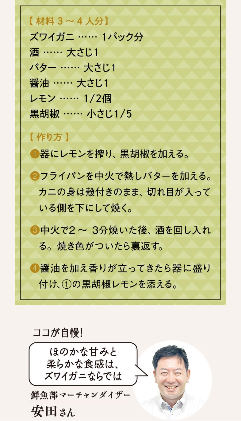 せっかくのズワイガニ。濃厚なうま味を閉じ込めるため“焼き”をご提案します! こってり味からのさっぱり味で、つい無限ループしそうです。