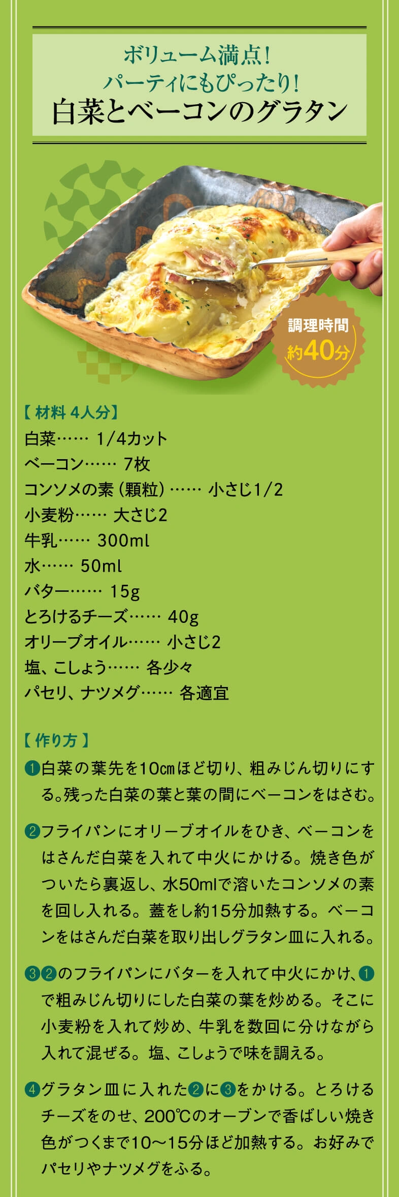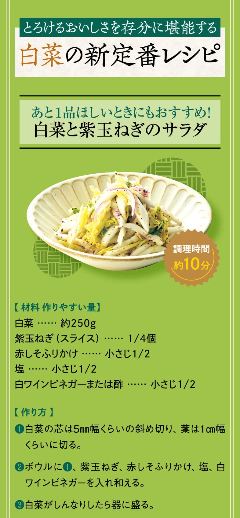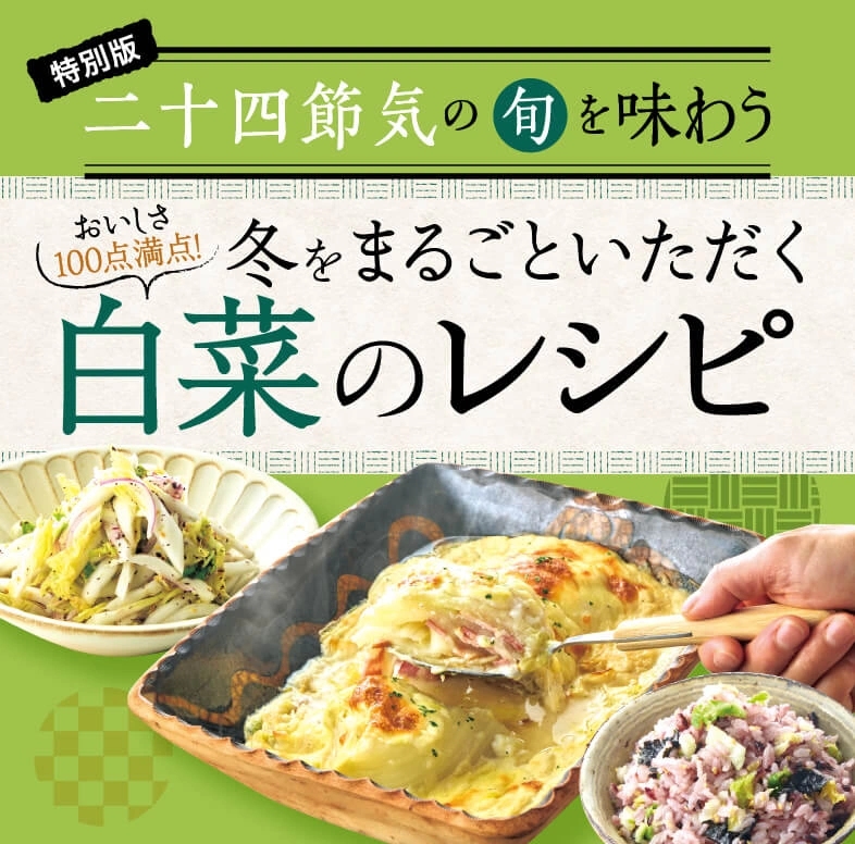 二十四節気とは、春夏秋冬を24に分け、それぞれの四季を表す名前を付けたもの。今月は旬の食材を使ったオリジナルレシピを紹介する人気連載を特別版に拡大し、白菜の絶品レシピをお届け。旬真っ盛りの味わいを心ゆくまで堪能しましょう。
