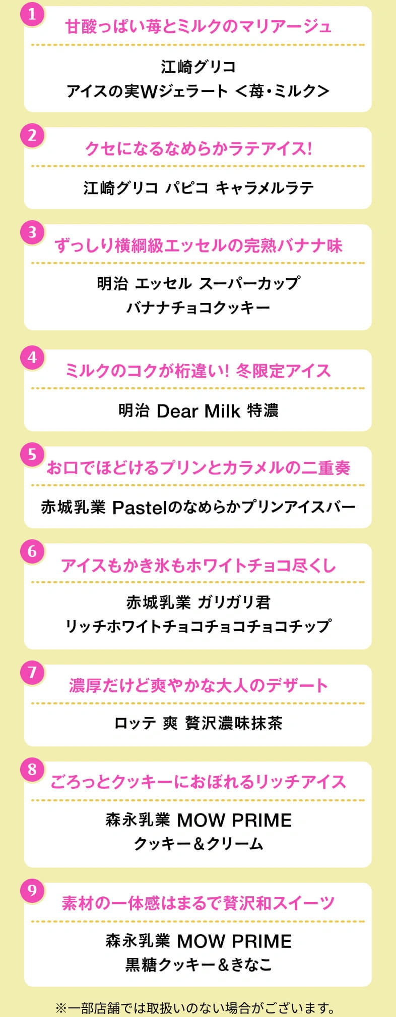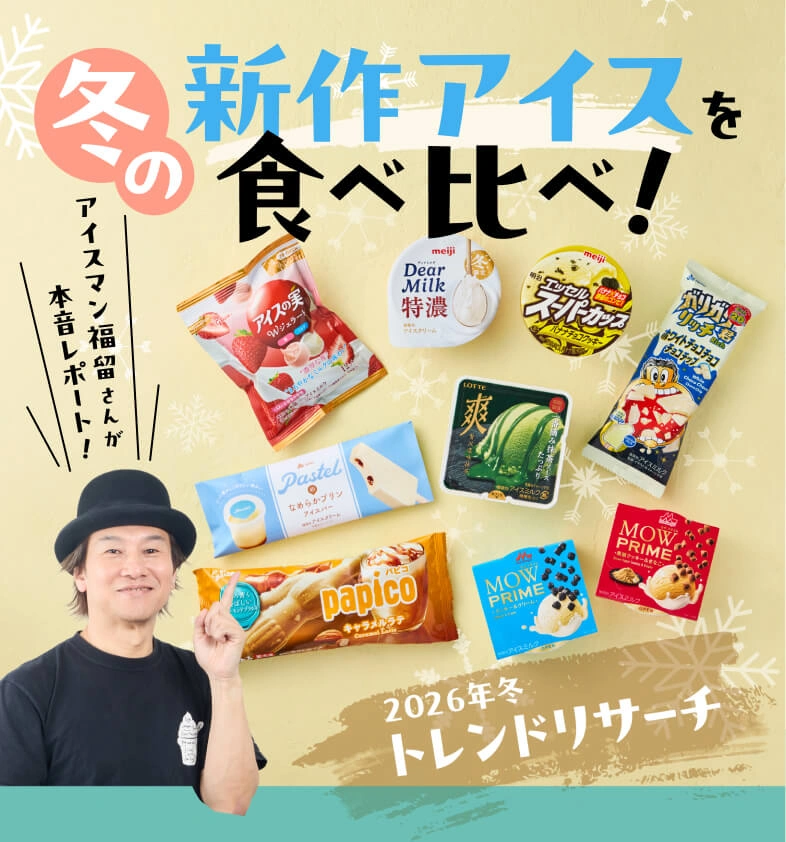 この冬もロングセラーの新フレーバーからスイーツのような新顔アイスまで、魅力的なラインナップが勢ぞろい! どれを食べようか迷うあなたのために、アイスのプロに冬の新作アイス9品を本音レビューしてもらいました。お気に入りの冬アイスを見つけてくださいね。