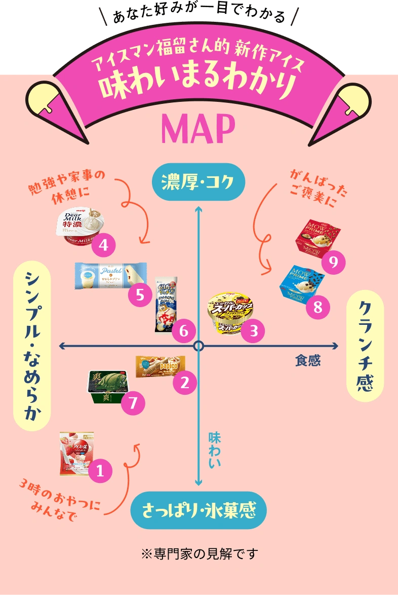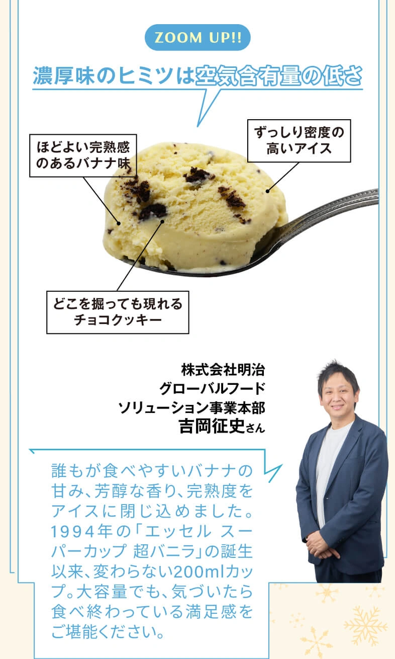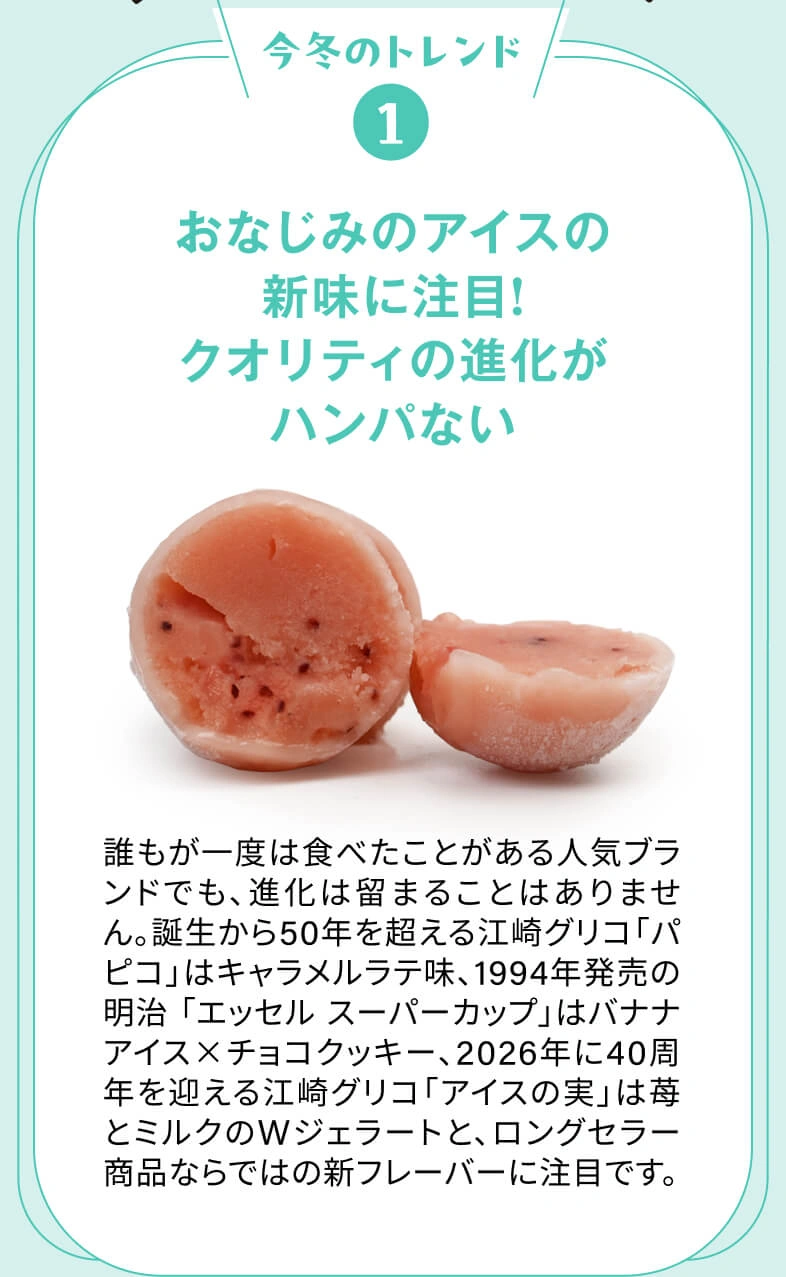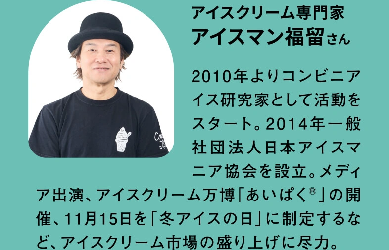 取材協力/アイスクリーム専門家 アイスマン福留さん・江崎グリコ株式会社 健康イノベーション事業本部 増田秀人さん・株式会社明治 グローバルフードソリューション事業本部 吉岡征史さん・株式会社明治 同本部 岩井麻衣さん・赤城乳業株式会社 開発マーケティング本部 最上日菜乃さん・株式会社ロッテ マーケティング本部 北村考志さん・森永乳業株式会社 営業本部 柏倉翔さん