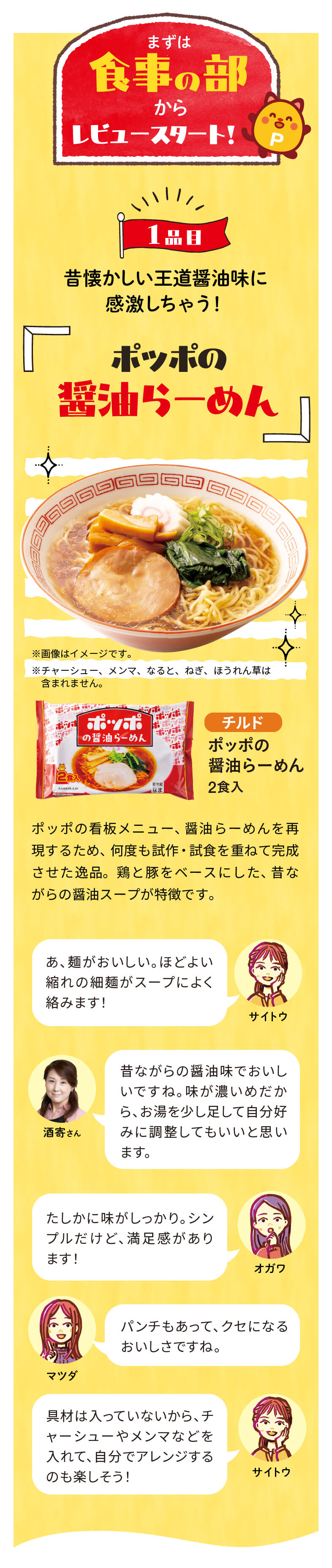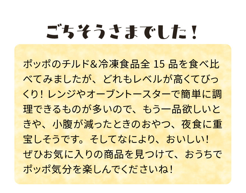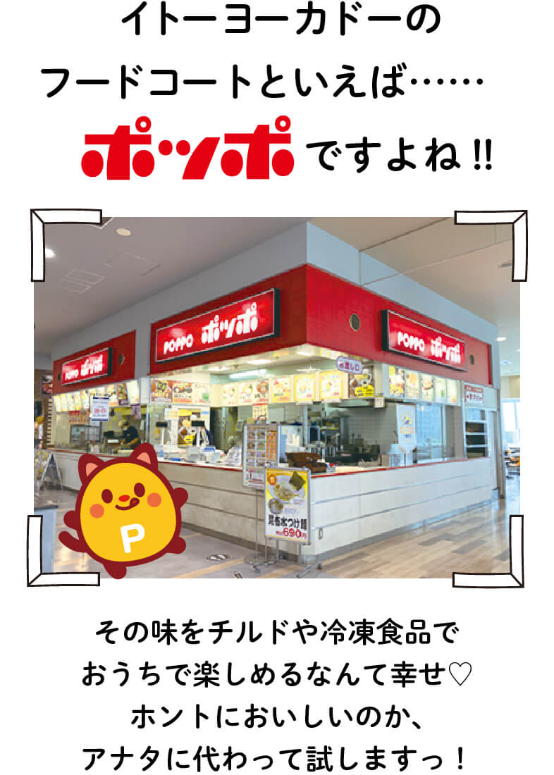 みなさま、大ニュースです! イトーヨーカドー内にあるフードコート「ポッポ」の人気メニューが、チルド&冷凍食品になって登場しました。醤油らーめんやポテト、今川焼といったおなじみの味はもちろん、クレープやたい焼、ナポリタンなど、お店にはない新しいメニューも登場しているんです。これは気になる……! ということで、料理研究家・酒寄美奈子さんとはとぼん編集部(サイトウ・オガワ・マツダ)が集合。全15品を実際に食べてみました。はたしてお店の味は再現されているのか、それとも新たなおいしさなのか? ポッポファンも、まだ食べたことがない人も必見です!
