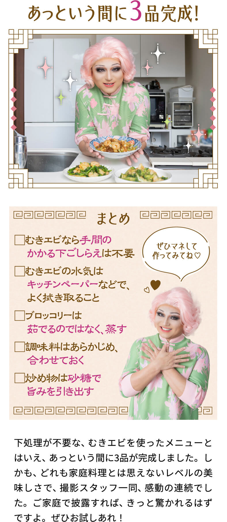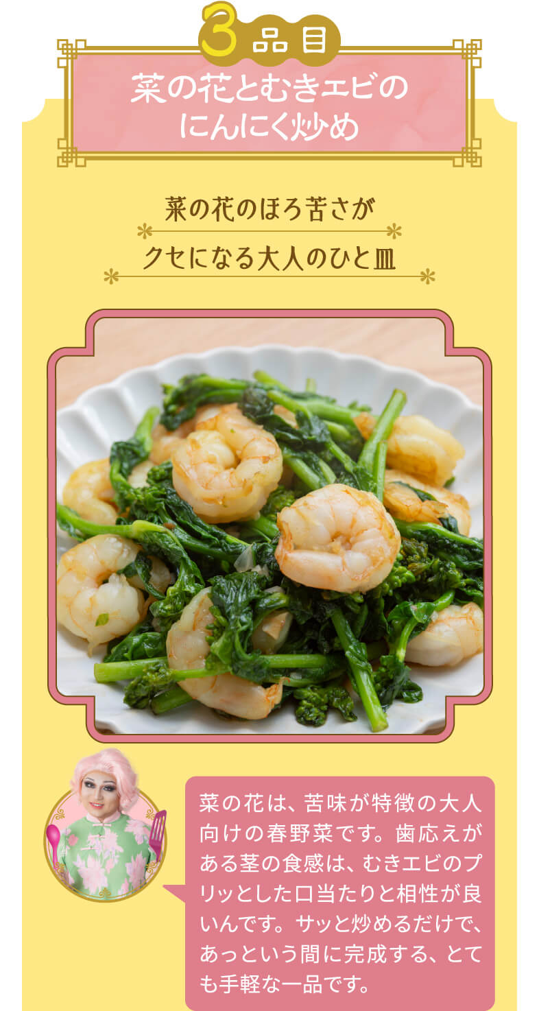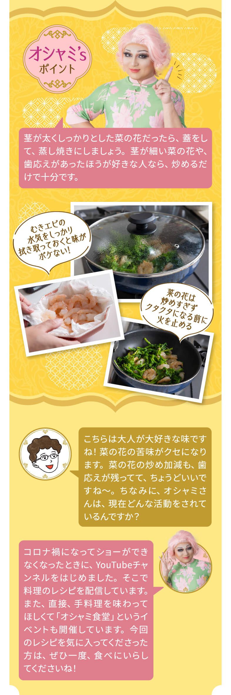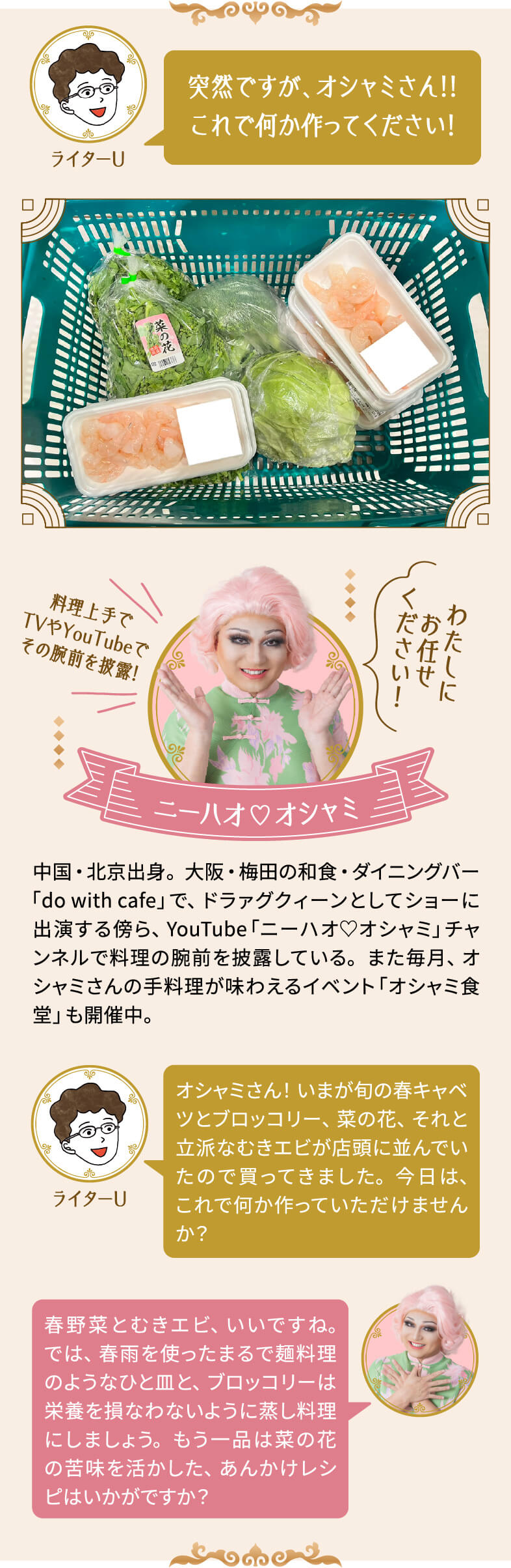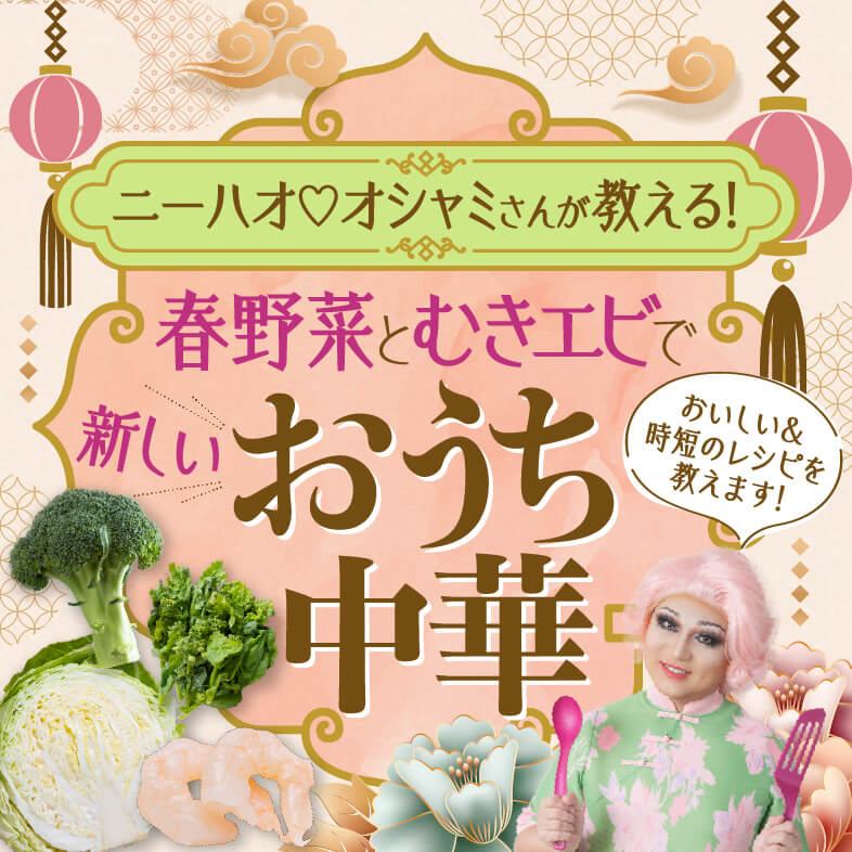 キャベツやブロッコリー、玉ねぎ、そして菜の花など、春は野菜が美味しい季節です。そして、どんな料理にも合わせやすい万能食材の代表格といえば、むきエビ! 今回、そんな食材を使って、いつもとはひと味違うガチ中華を披露してくれたのが、北京出身で料理上手なドラァグクィーン“ニーハオ♡オシャミ”さんです。手軽なのに、本格的な中華の味を、レパートリーに加えてみては?