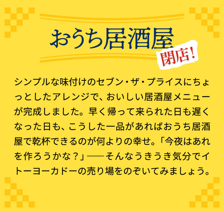 疲れて帰ってきた日は、かんたんな時短おつまみで一杯やりたいもの。そんなときにおすすめなのが「セブン・ザ・プライス」の食品を使ったおつまみメニュー。レシピを伝授してもらったのは、インスタグラムのおつまみレシピ投稿で人気のゆうきさん。「これならパパッと作れそう!」と思えるおつまみで、おうち居酒屋を始めましょう!