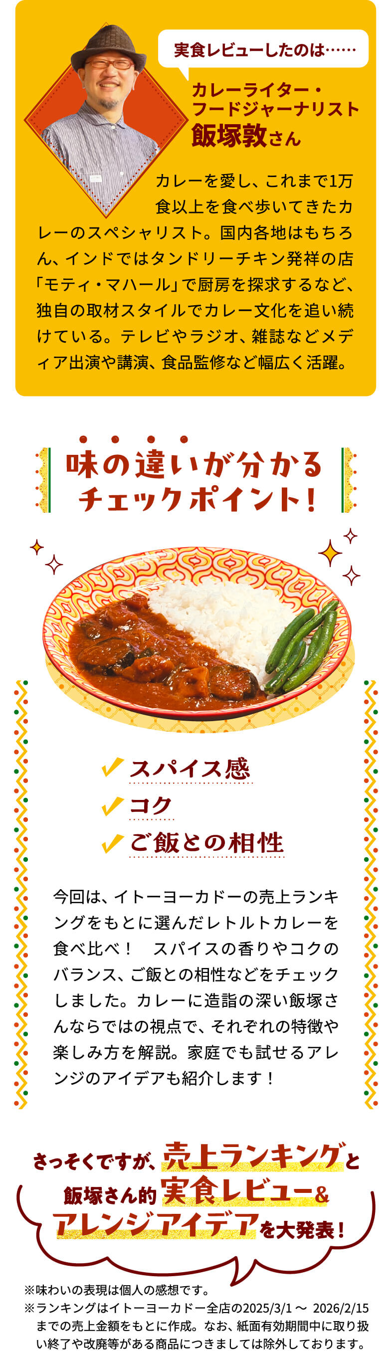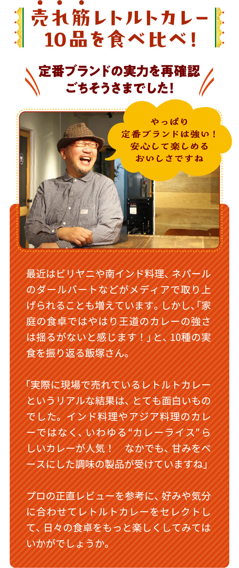 忙しい日のごはんにも頼れるレトルトカレー。温めるだけで手軽に食べれるうえ、最近は味のクオリティもぐんと上がり、専門店のような本格的な味わいを楽しめる商品も増えてきています。そこで今回は、イトーヨーカドーで人気のレトルトカレーの売上ランキングをもとに、はとぼん編集部が注目の10商品をピックアップ!カレーライターの飯塚敦さんにすべて実食してもらい、味わいや具材感、アレンジの楽しさなどのポイントを正直レビューしてもらいました。売れ筋カレーの実力を、ぜひチェックしてみてください!