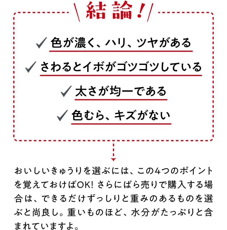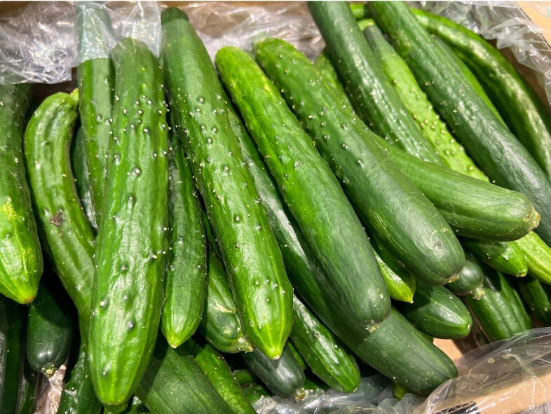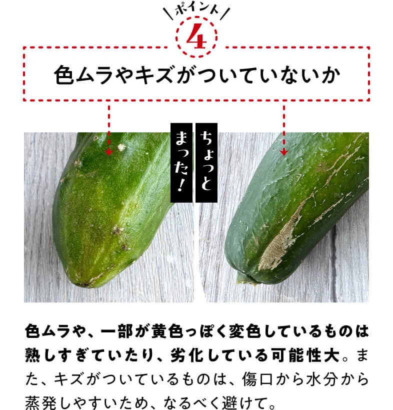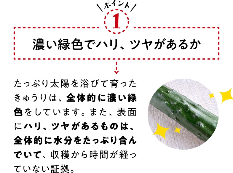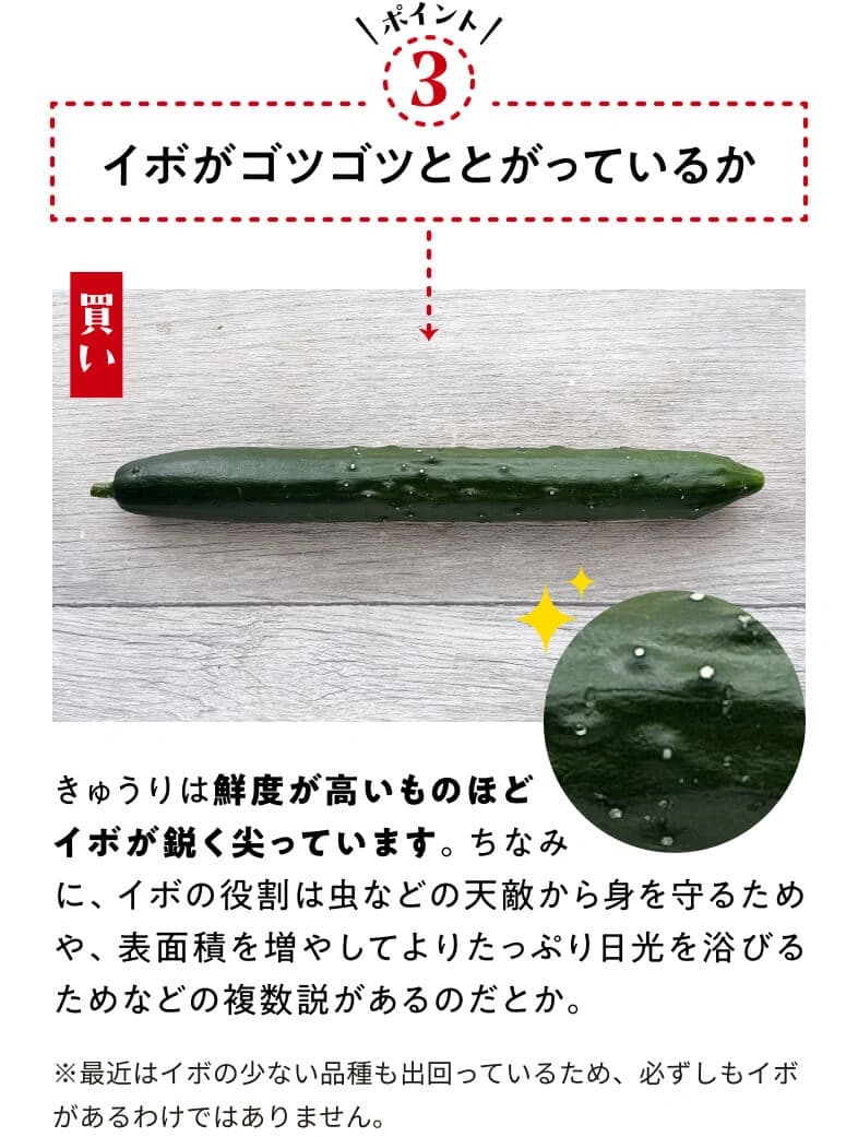 かつて“ブルーム”と呼ばれる白い粉に覆われているものが鮮度の良い証しとされていましたが、農薬と勘違いする人も多かったことから、品種改良されたブルームレス(ブルームがない)きゅうりが主流になりました。