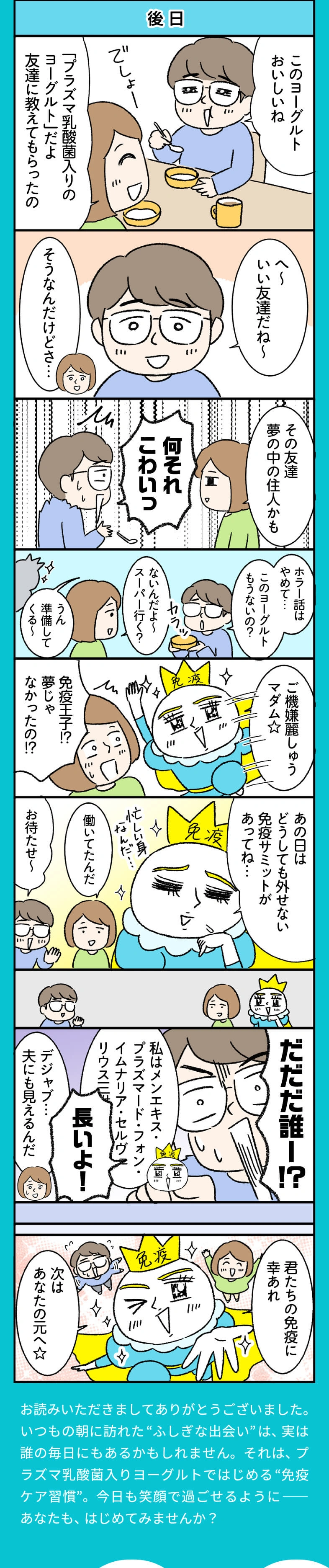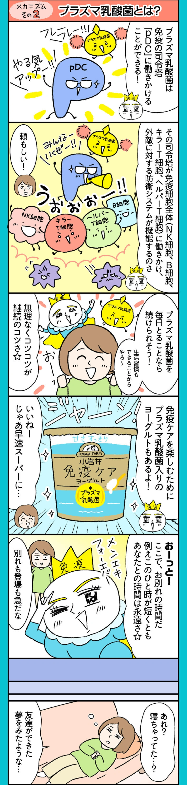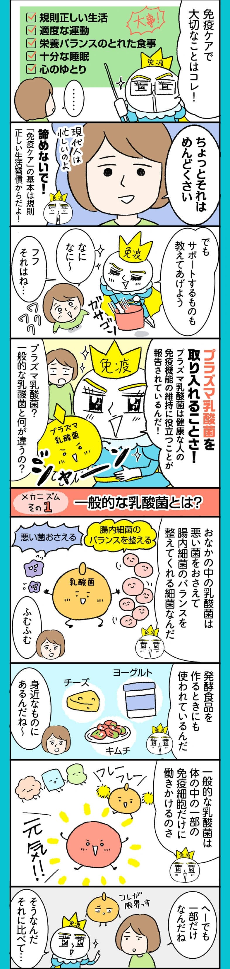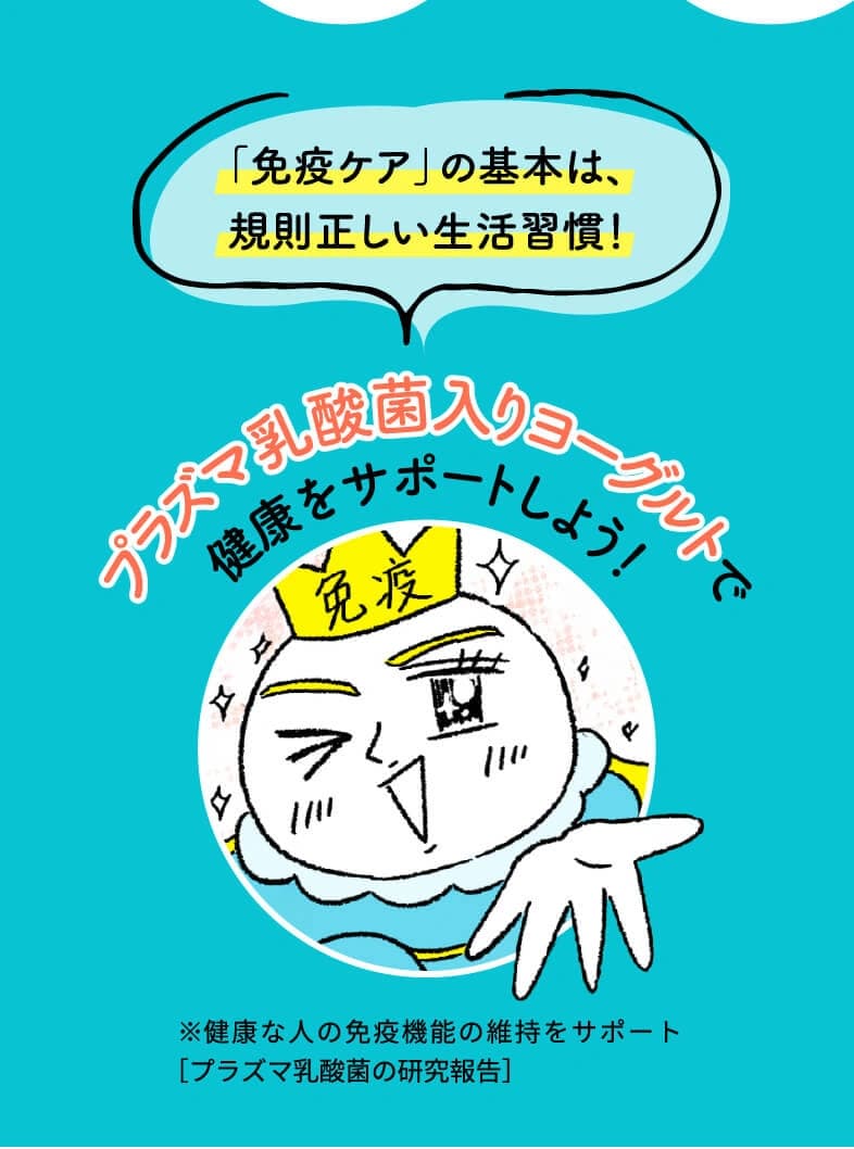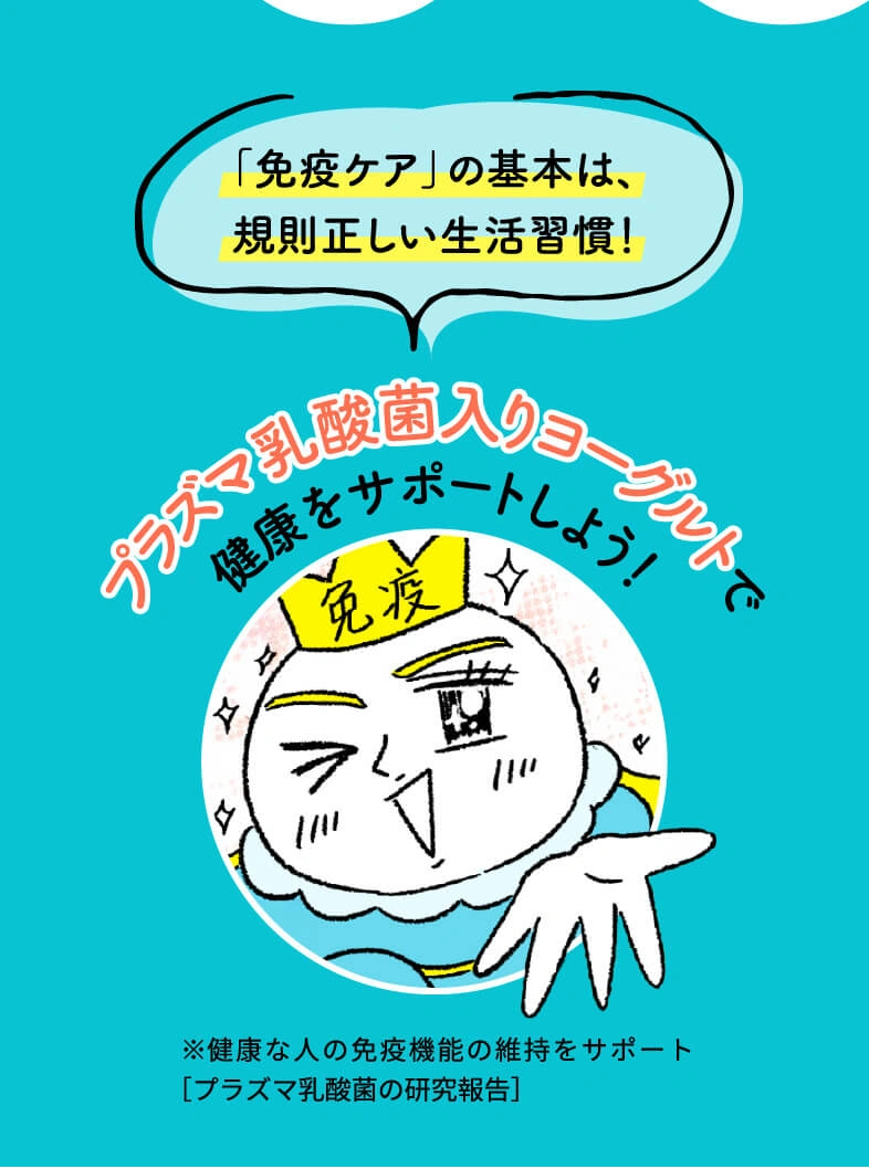 「免疫ケア」の基本は、規則正しい生活習慣。それに加えておすすめなのが、話題の“プラズマ乳酸菌”が入った小岩井乳業の「免疫ケアヨーグルト」です。プラズマ乳酸菌は、健康な人の免疫機能の維持をサポートしてくれることが報告されているんです。マンガで楽しく、小岩井「免疫ケアヨーグルト」のヒミツをのぞいてみましょう!