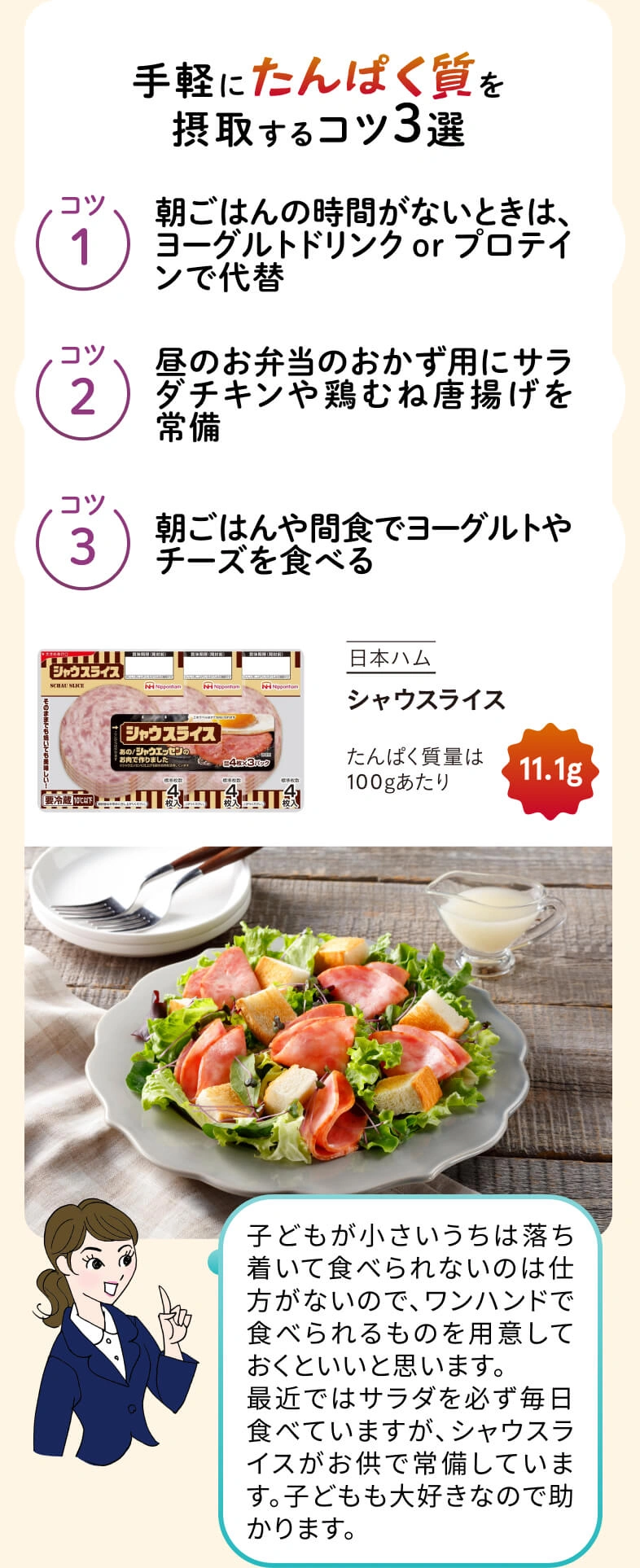 最近、年代・性別を問わず注目が高まっているたんぱく質。コンビニやスーパーでも「たんぱく質が摂れる!」とうたう商品を見かける機会が増えています。ところで、なぜたんぱく質を摂った方がいいの? どう摂ればいいの? そんな疑問に答えるべく、日本ハムさんに、たんぱく質の重要性と手軽な取り入れ方を聞いていきます!