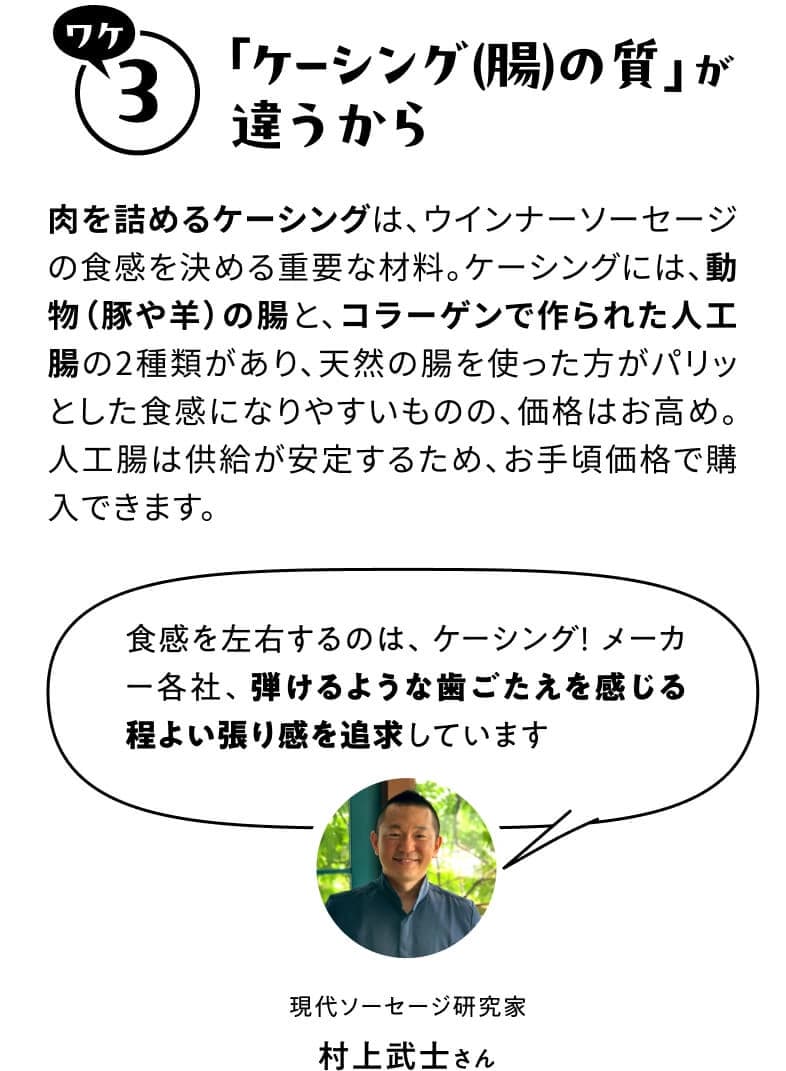 スーパーマーケットでいつも手に取る定番アイテム。その隣に並ぶちょっとお高いアイテムを見ると、「高ければ高いほどおいしいの?」「安いものは何が違うの?」というギモンが湧きますよね。でも、価格の理由をきちんと知れば、「私はコレ!」と自信を持って選べるハズ。今回は、忙しい朝食やお手軽ランチで大活躍のウインナーソーセージについて、現代ソーセージ研究家の村上武士さんにお話を伺いました。ウインナーソーセージのおいしさのヒミツ、そして選び方のポイントとは?