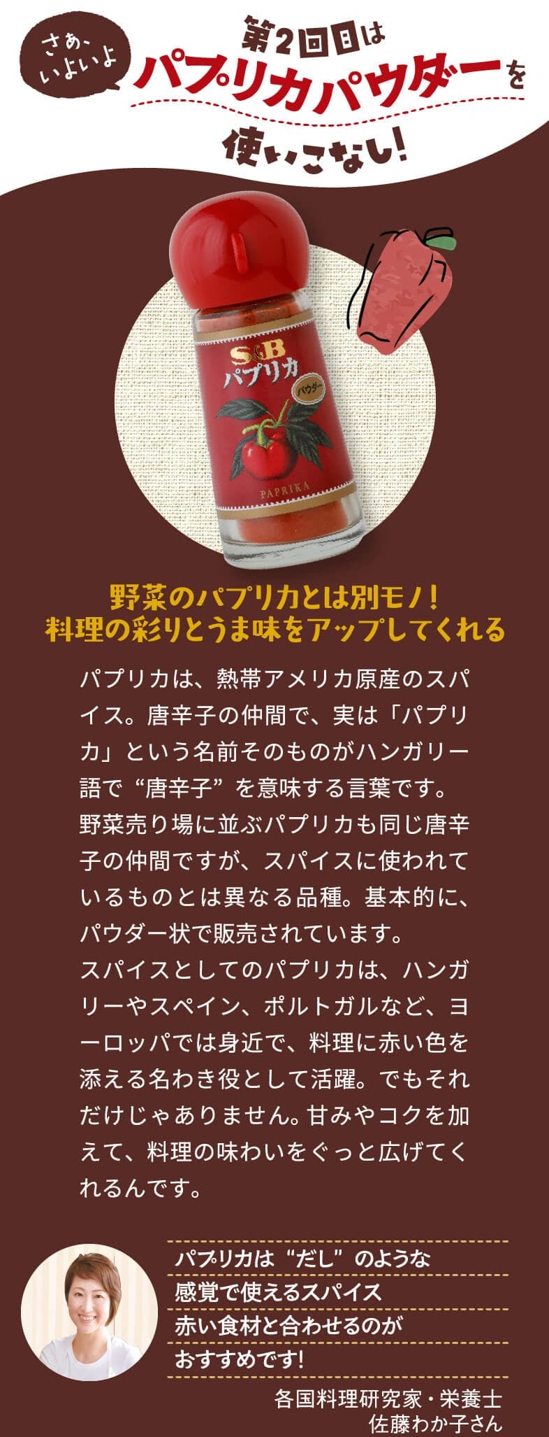 スーパーのスパイス売場、素通りしてほとんど活用したことがない人が、意外と多いのでは?実はスパイスは、カレーだけでなくいつもの料理にも大活躍。ほんのひと振りで料理の表情を劇的に変えたり、食卓に異国の雰囲気が広がったり、その可能性は無限大です。この連載では、スパイスの魔術師!?でもある料理研究家・佐藤わか子さんと一緒に『スパイスの使いこなし術』をご提案。第1回でクミンについて学び、スパイスのめくるめく世界に魅了されたところで、第2回は『パプリカパウダー』。意外な使い方もご紹介しちゃいます!