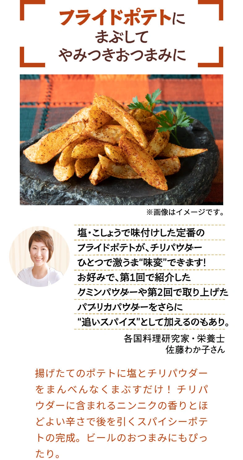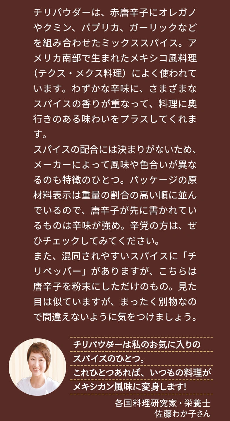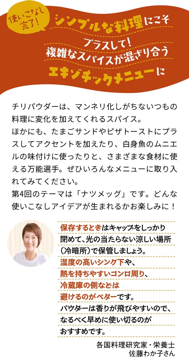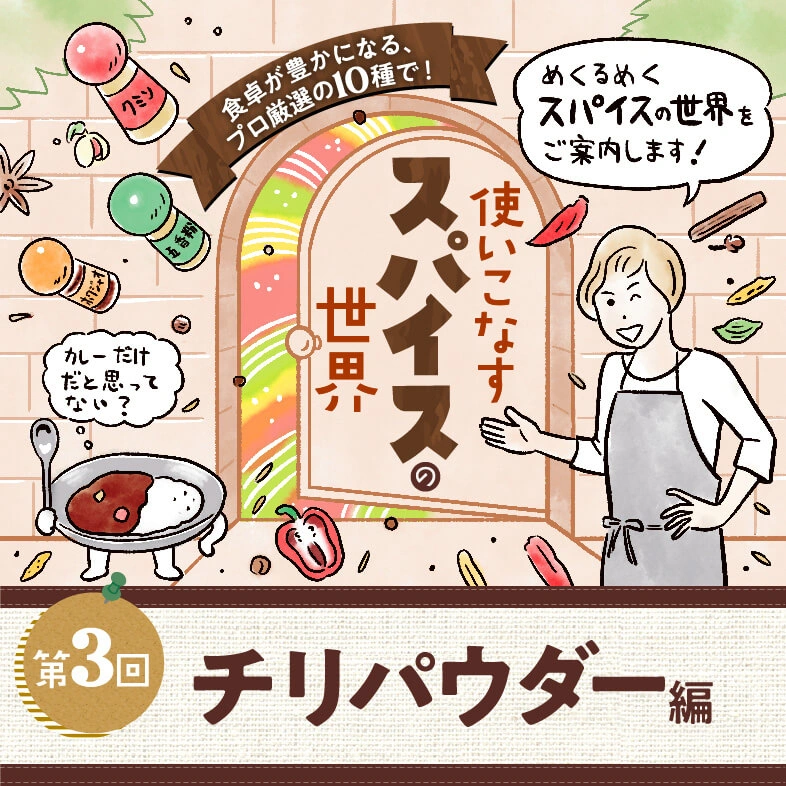 スーパーのスパイス売場、素通りしてほとんど活用したことがない人が、意外と多いのでは?実はスパイスは、カレーだけでなくいつもの料理にも大活躍。ほんのひと振りで料理の表情を劇的に変えたり、食卓に異国の雰囲気が広がったり、その可能性は無限大です。この連載では、スパイスの魔術師!?でもある料理研究家・佐藤わか子さんと一緒に『スパイスの使いこなし術』をご提案。第2回でパプリカパウダーの使い方をマスターしたところで、第3回は『チリパウダー』。意外な使い方もご紹介しちゃいます!