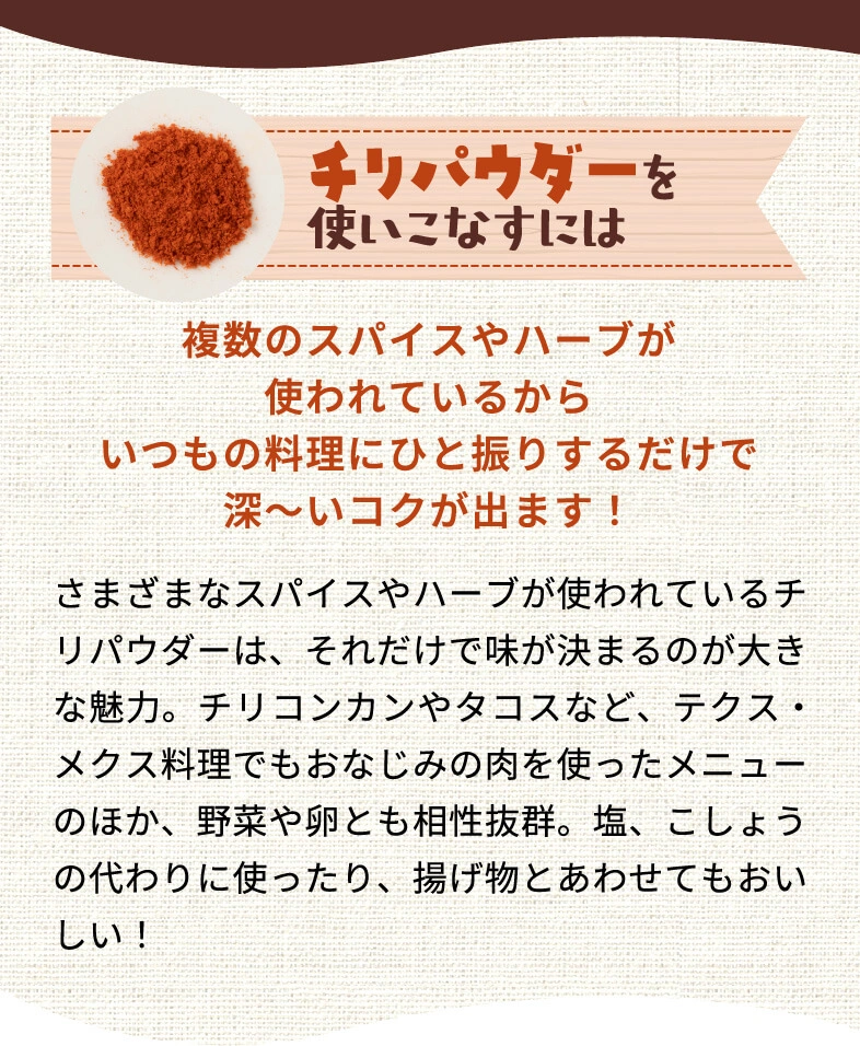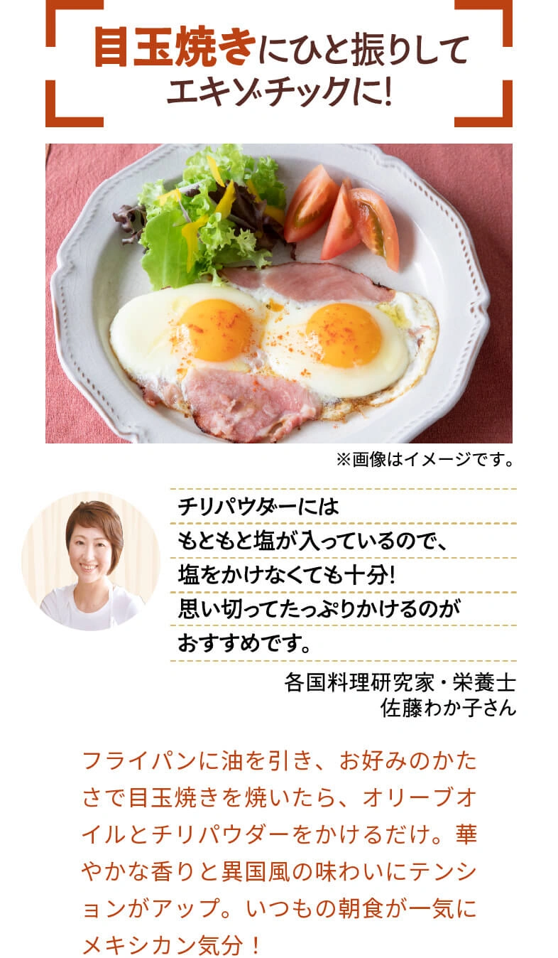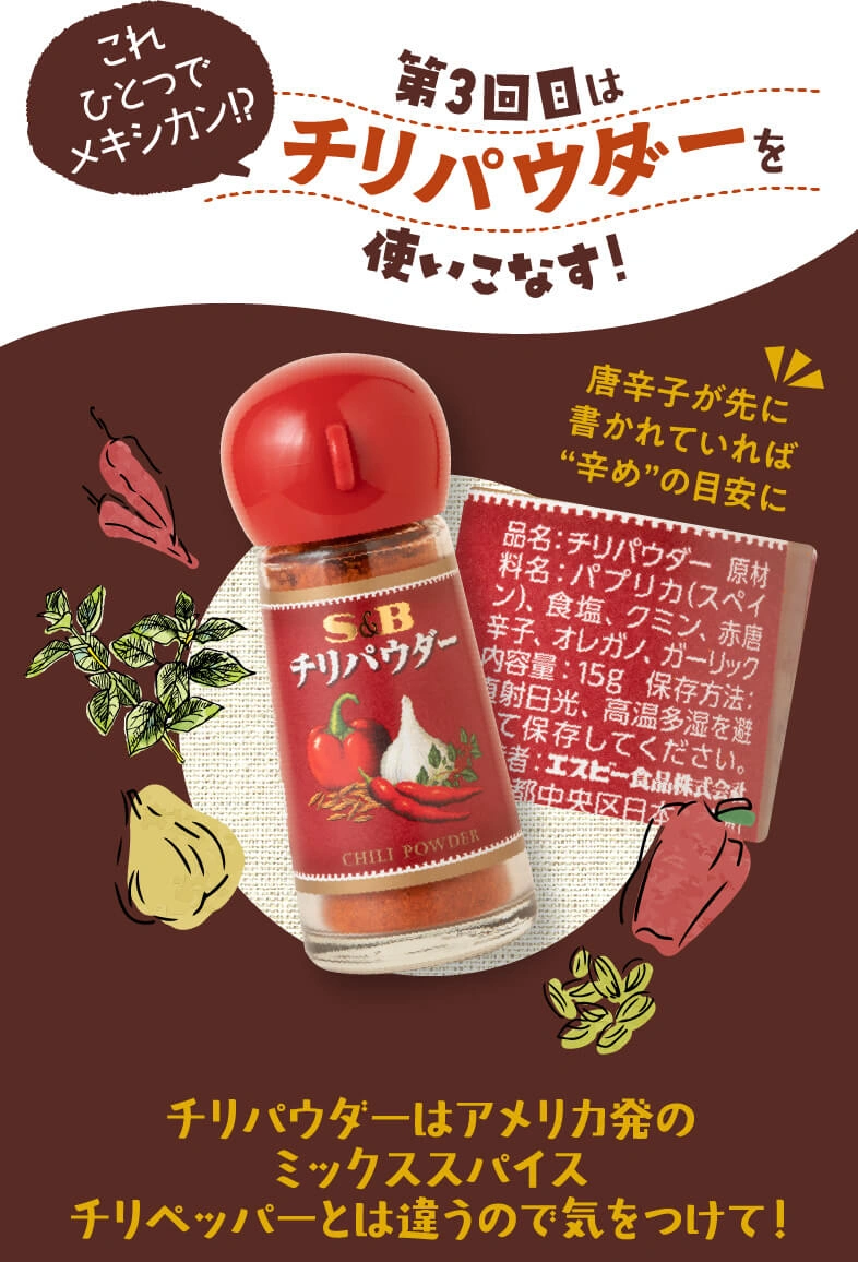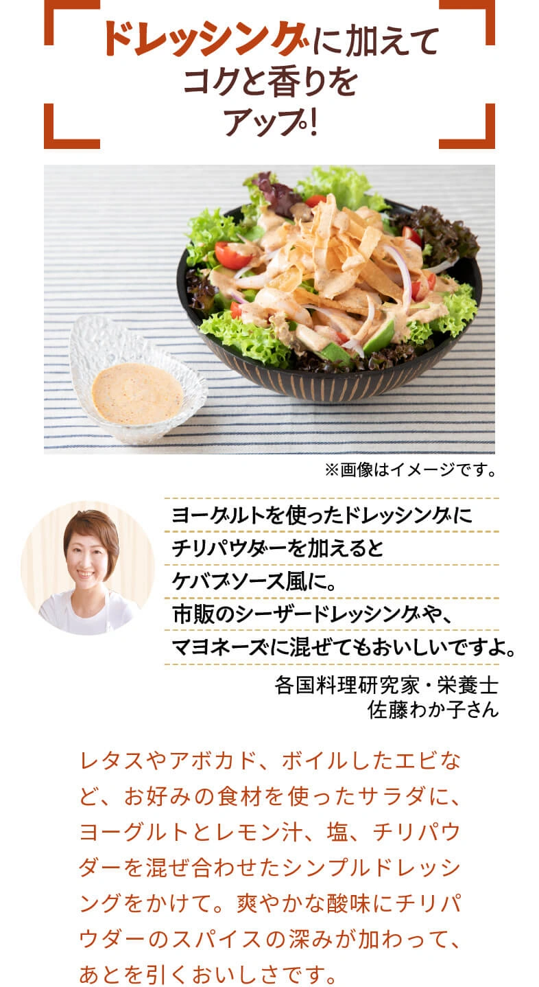 スーパーのスパイス売場、素通りしてほとんど活用したことがない人が、意外と多いのでは?実はスパイスは、カレーだけでなくいつもの料理にも大活躍。ほんのひと振りで料理の表情を劇的に変えたり、食卓に異国の雰囲気が広がったり、その可能性は無限大です。この連載では、スパイスの魔術師!?でもある料理研究家・佐藤わか子さんと一緒に『スパイスの使いこなし術』をご提案。第2回でパプリカパウダーの使い方をマスターしたところで、第3回は『チリパウダー』。意外な使い方もご紹介しちゃいます!
