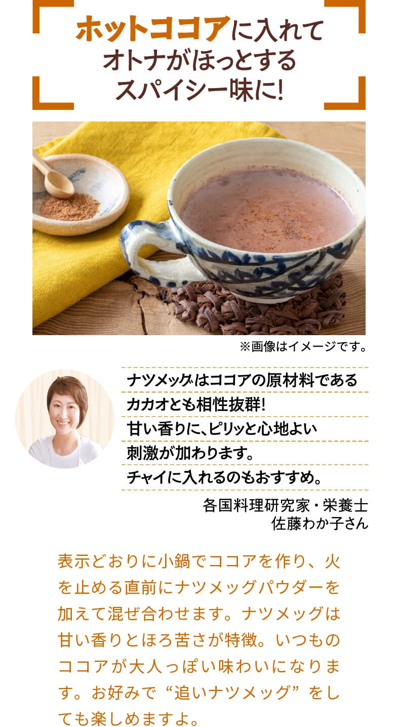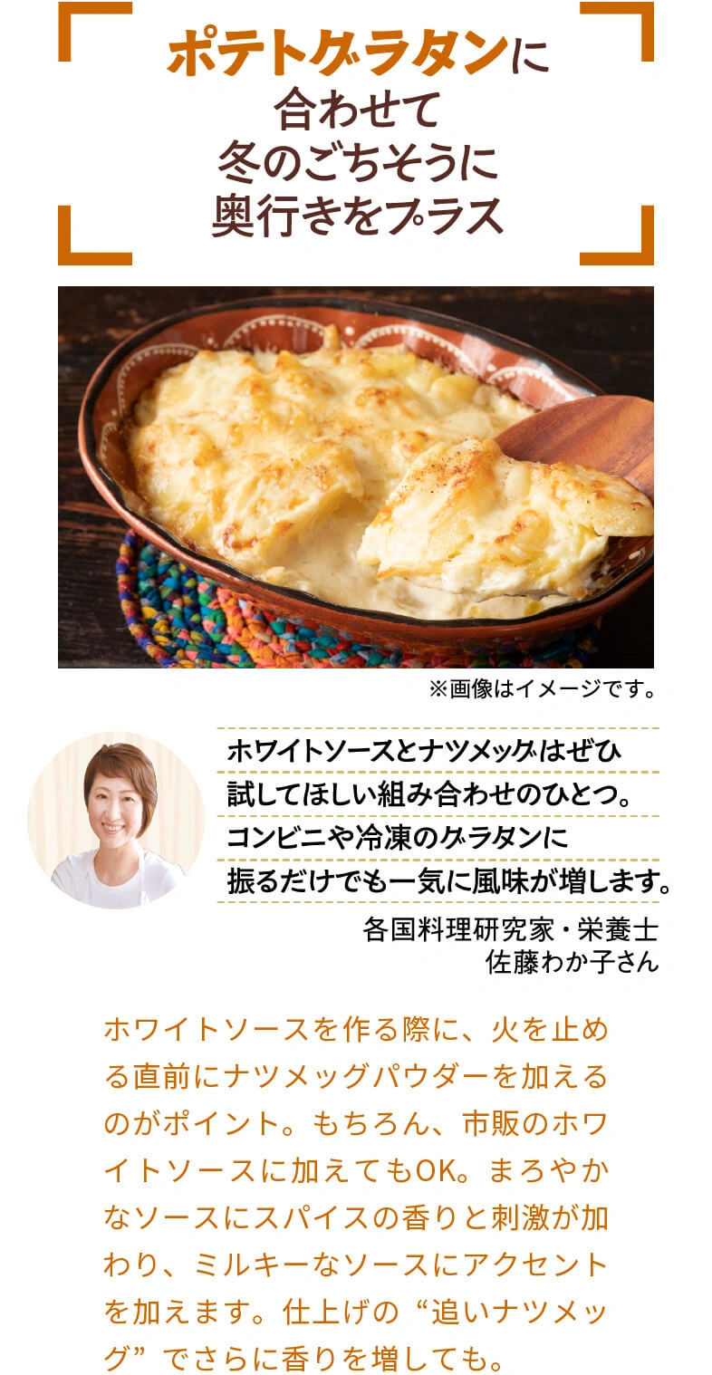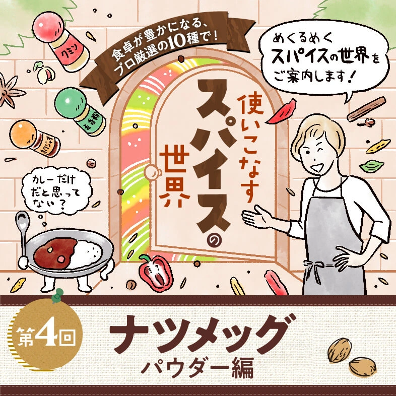 スーパーのスパイス売場、素通りしてほとんど活用したことがない人が、意外と多いのでは?実はスパイスは、カレーだけでなくいつもの料理にも大活躍。ほんのひと振りで料理の表情を劇的に変えたり、食卓に異国の雰囲気が広がったり、その可能性は無限大です。この連載では、スパイスの魔術師!?でもある料理研究家・佐藤わか子さんと一緒に『スパイスの使いこなし術』をご提案。第3回ではチリペッパーを使いこなし、自宅で気軽に楽しめるメキシカンを堪能しました。第4回のスパイスは『ナツメッグパウダー』。肉料理だけでなく、乳製品とも相性抜群なんです!