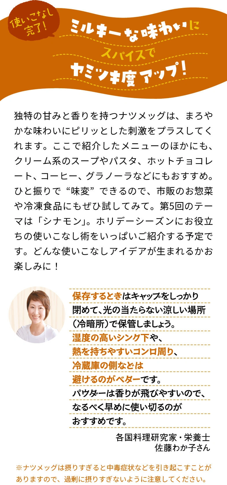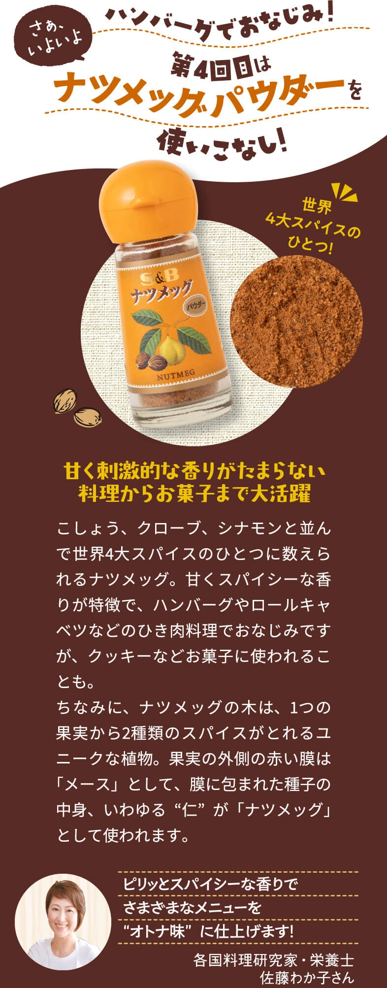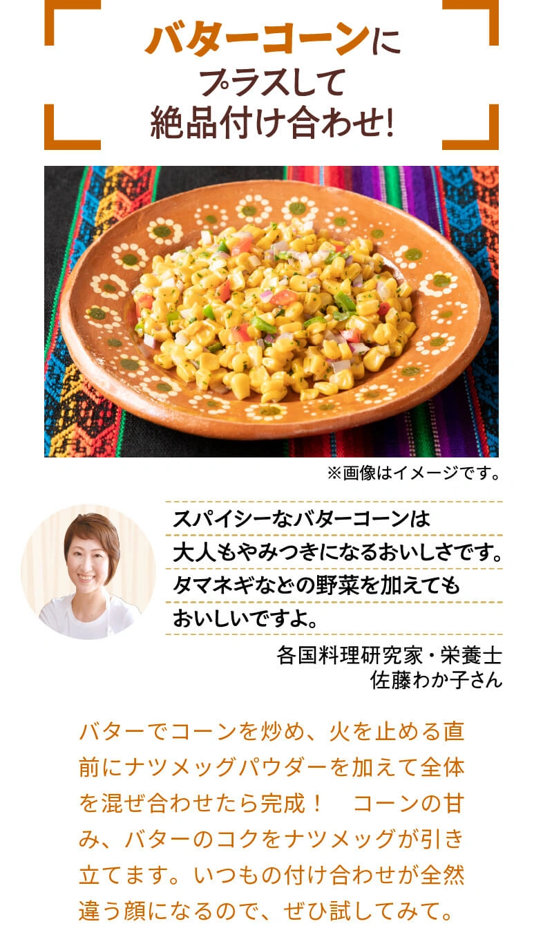 スーパーのスパイス売場、素通りしてほとんど活用したことがない人が、意外と多いのでは?実はスパイスは、カレーだけでなくいつもの料理にも大活躍。ほんのひと振りで料理の表情を劇的に変えたり、食卓に異国の雰囲気が広がったり、その可能性は無限大です。この連載では、スパイスの魔術師!?でもある料理研究家・佐藤わか子さんと一緒に『スパイスの使いこなし術』をご提案。第3回ではチリペッパーを使いこなし、自宅で気軽に楽しめるメキシカンを堪能しました。第4回のスパイスは『ナツメッグパウダー』。肉料理だけでなく、乳製品とも相性抜群なんです!