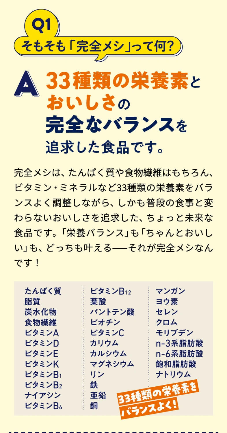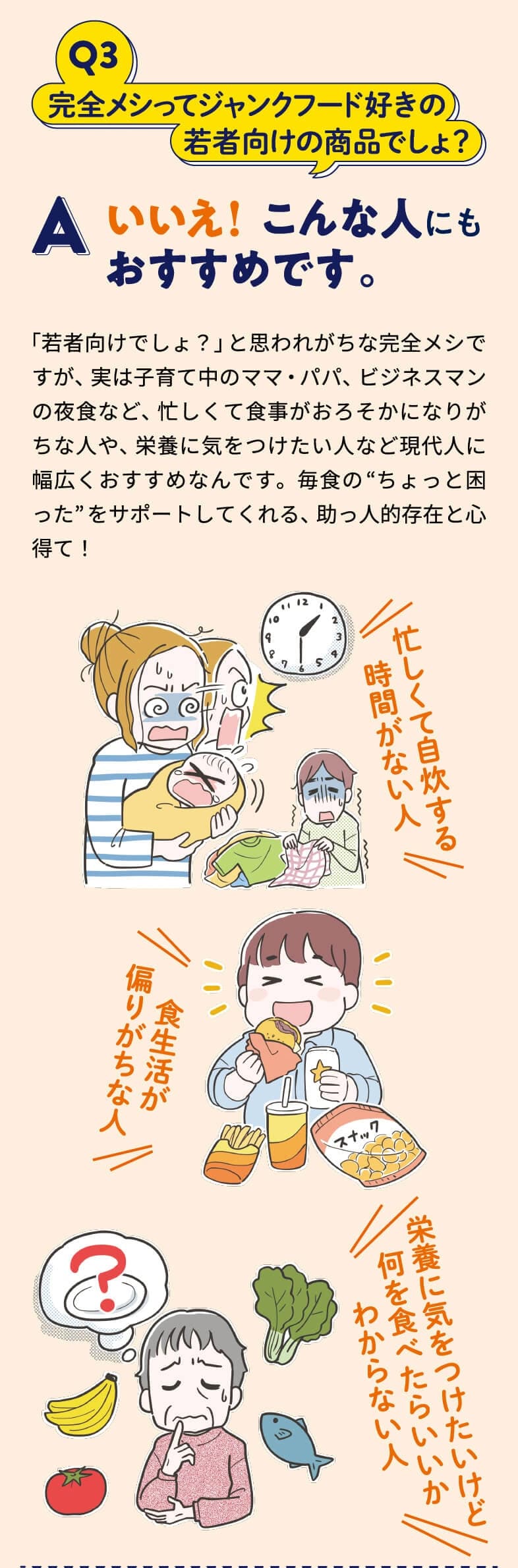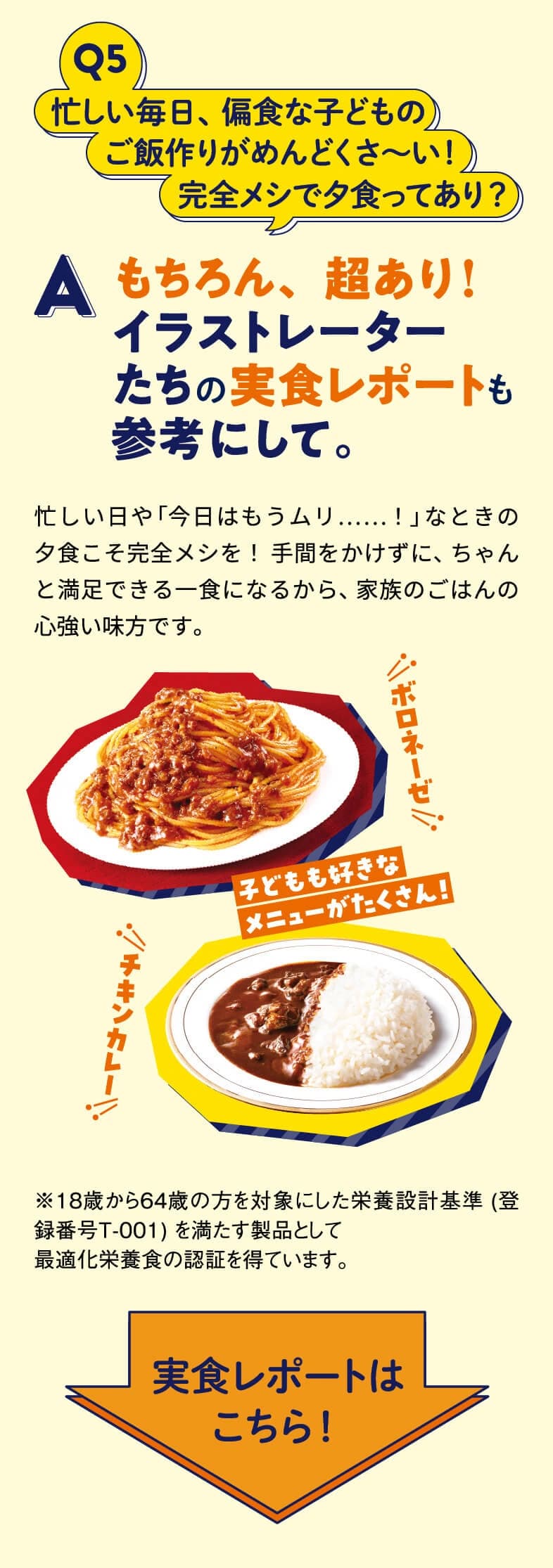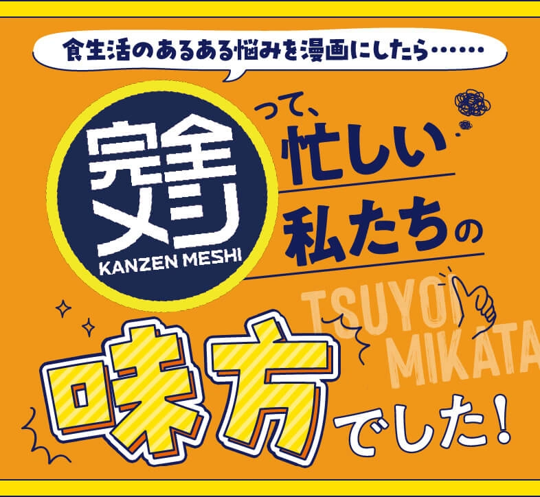 栄養とおいしさのバランスが完全⁈ 完全メシの正体にQ&A形式で迫ります。さらに、日々忙しく生活するイラストレーター3名の実食レポートもご紹介!
