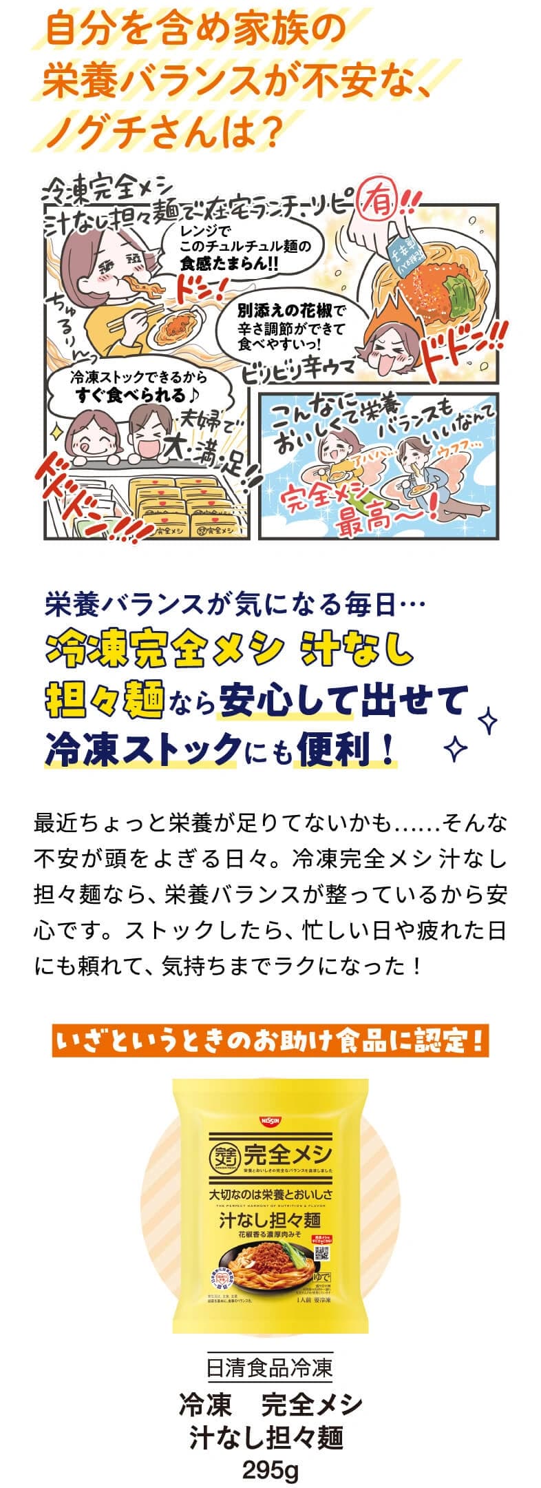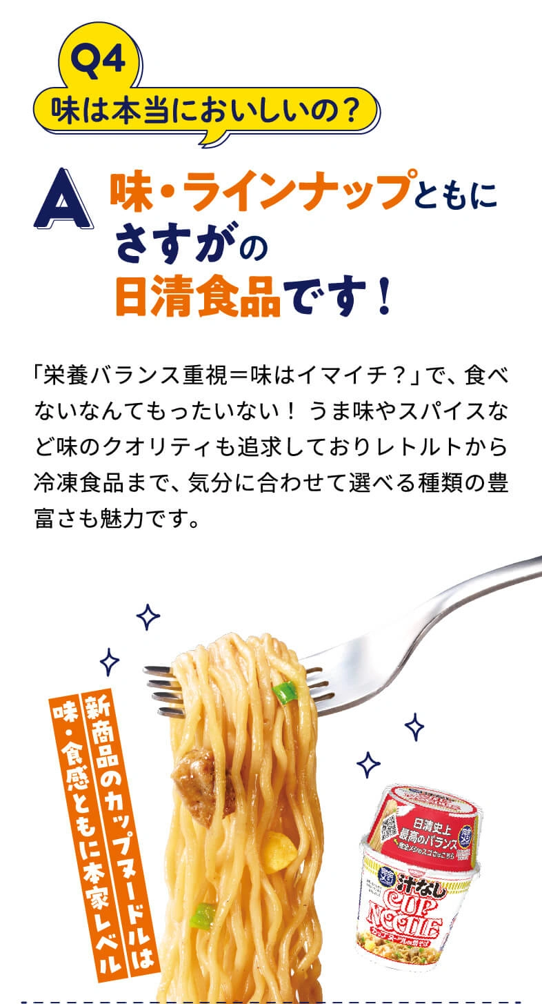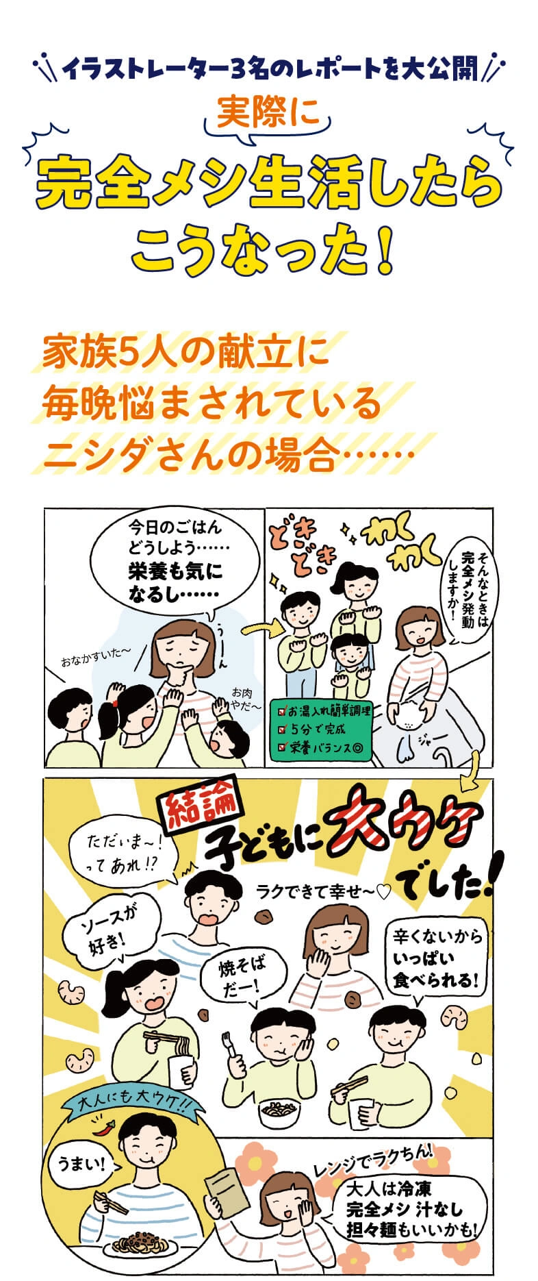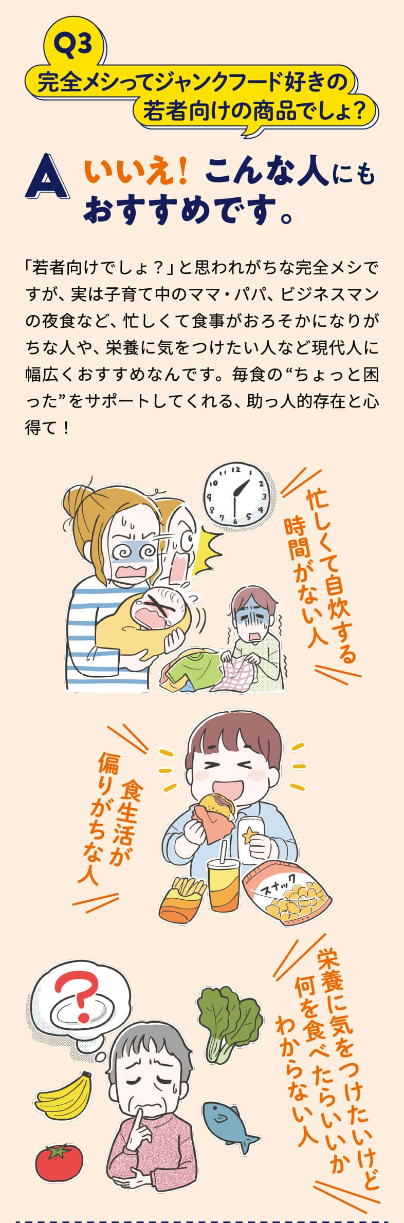 栄養とおいしさのバランスが完全⁈ 完全メシの正体にQ&A形式で迫ります。さらに、日々忙しく生活するイラストレーター3名の実食レポートもご紹介!