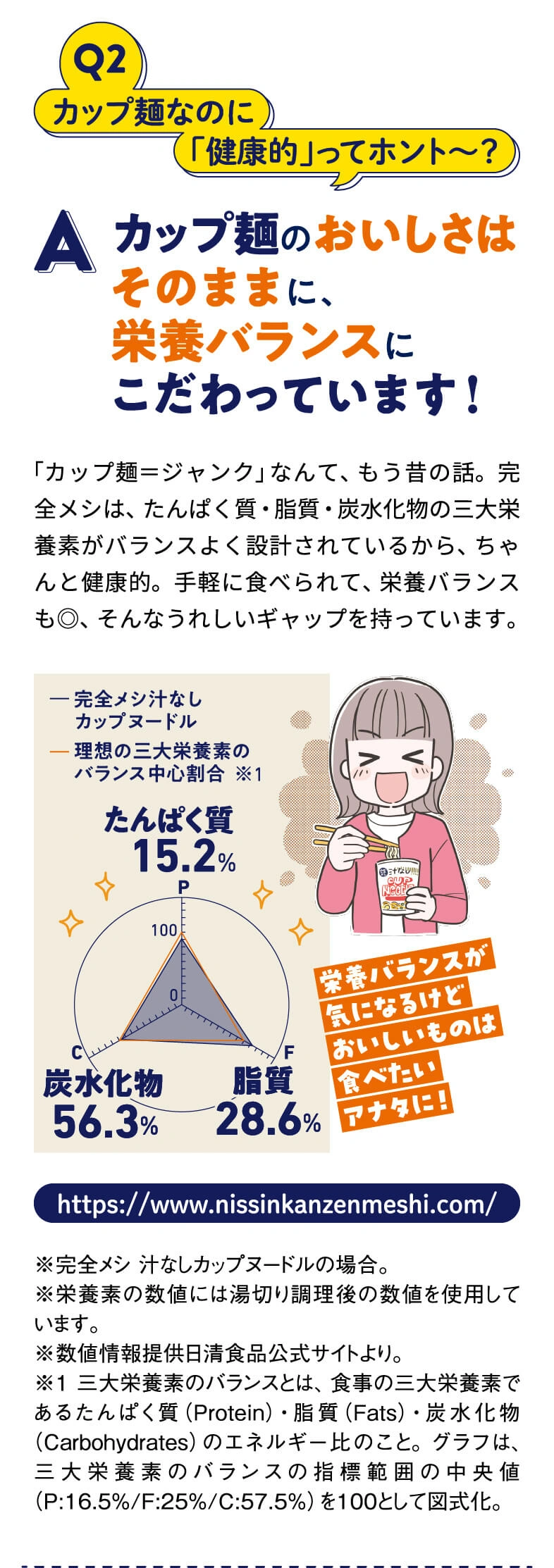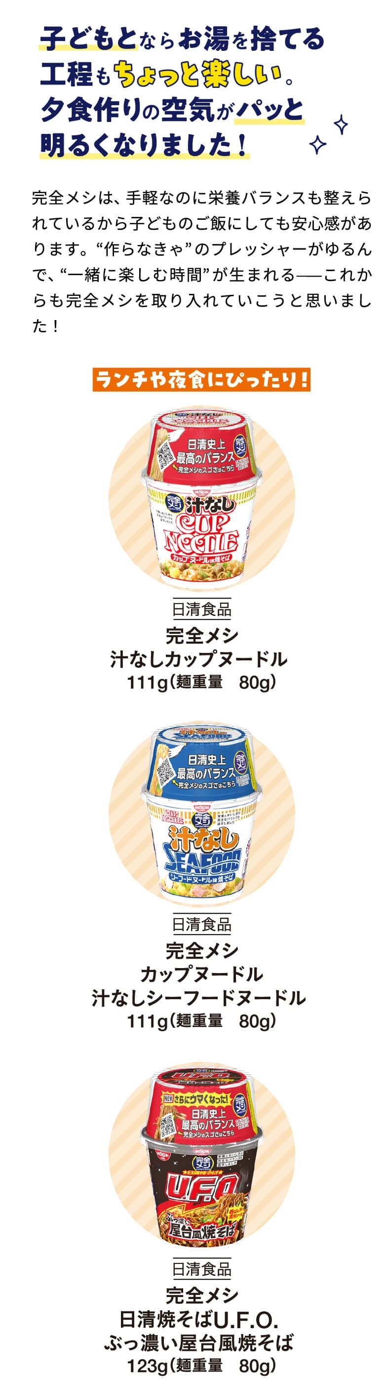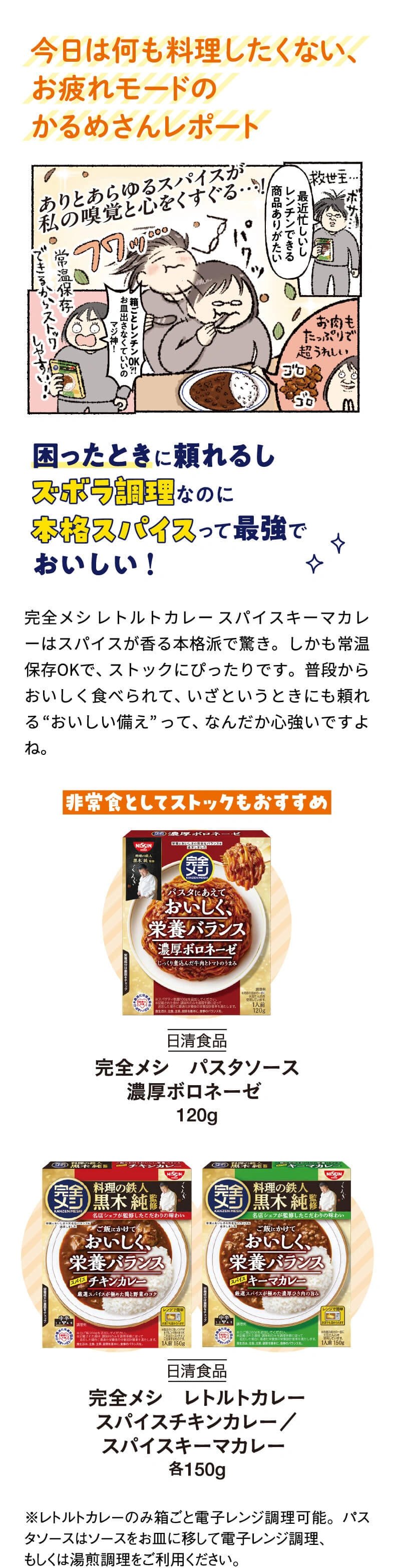 栄養とおいしさのバランスが完全⁈ 完全メシの正体にQ&A形式で迫ります。さらに、日々忙しく生活するイラストレーター3名の実食レポートもご紹介!