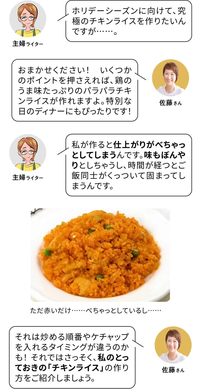 洋食屋さんでは定番のチキンライス。材料は簡単に手に入るものばかりだし、具材とご飯を炒めるだけ。家庭でも手軽に作れるメニューのひとつです。私・ライターOももちろん作りますが、お店で食べるのとなんか違う。仕上がりがべちゃっとしたり、味が決まらずただのケチャップライスになったり……。料理本やネットのレシピを参考に作ってみるけど、納得いく味にならず……。何かポイントがあるはずとプロに助けを求めることにしました。