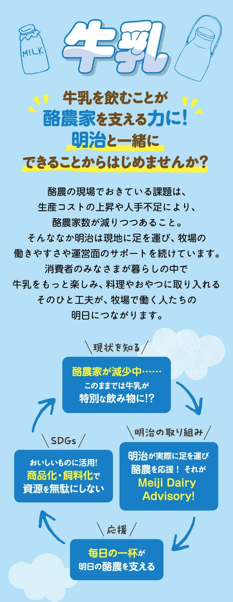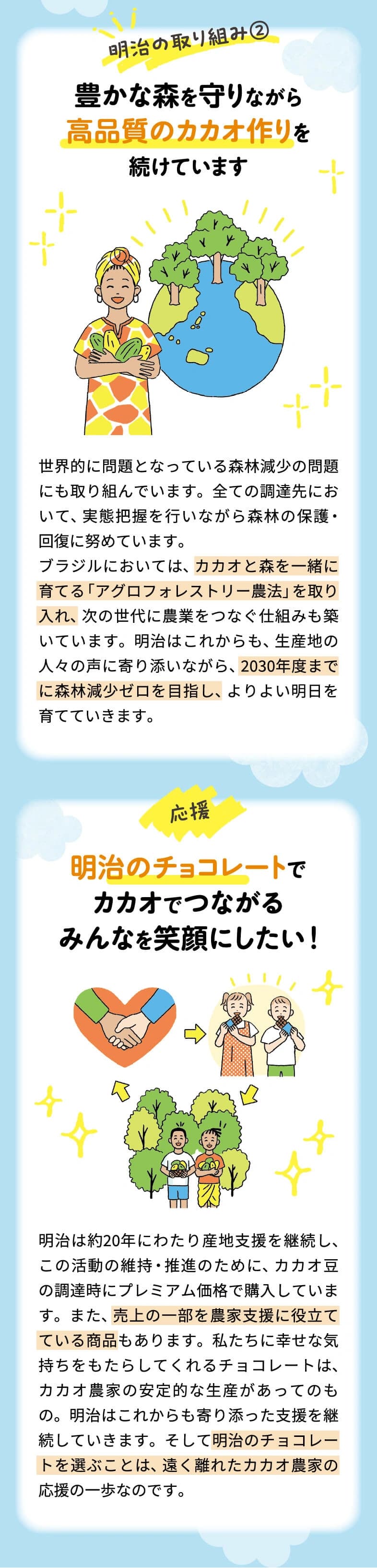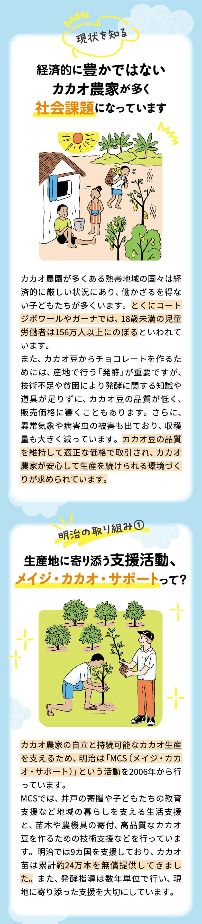 乳製品やチョコレート作りは、多くの生産者の力で支えられています。しかし今、現場は経営難や貧困に直面しています。そんな未来を変えるために、明治が行なっているサステナブル活動(持続可能な生産応援)をお伝えします。少しでも応援できることを、一緒に見つけてみませんか?