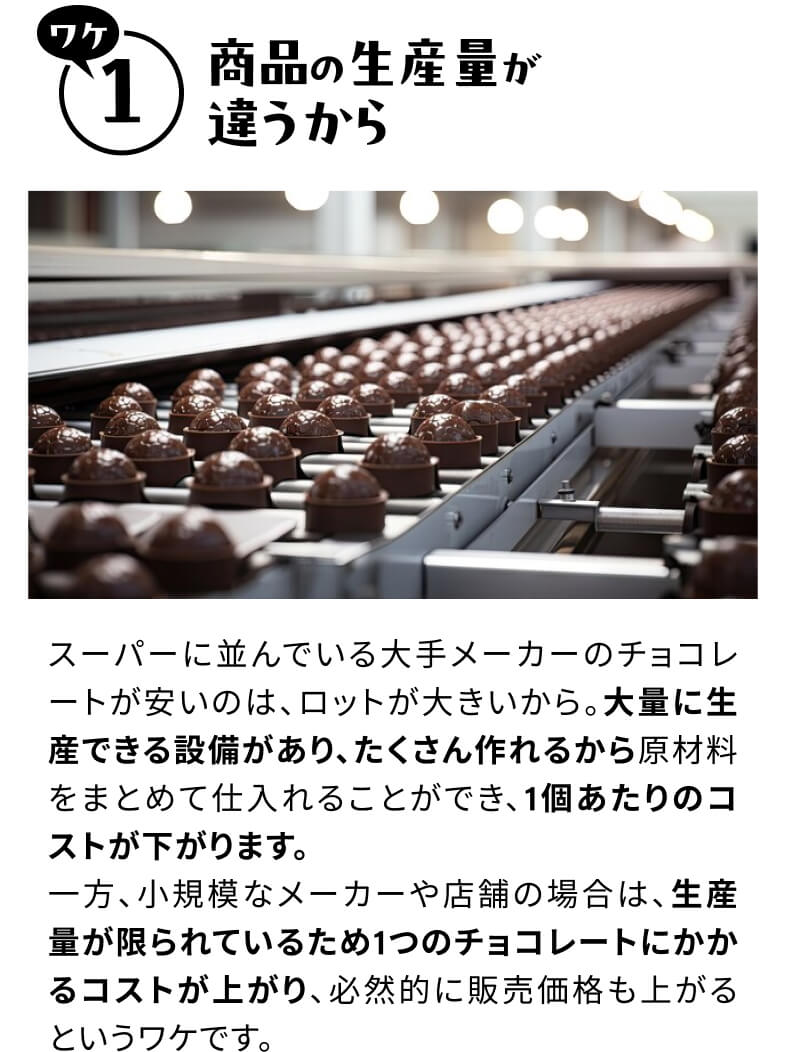 チョコレートは原材料や味はもちろん、パッケージやチョコレート自体のデザイン、ブランドイメージなどによっても価格差が出ます。