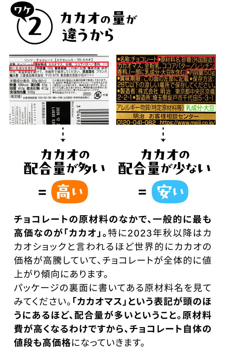 スーパーマーケットでいつも手に取る定番アイテム。その隣に並ぶちょっとお高いアイテムを見ると、「高ければ高いほどおいしいの?」「安いものは何が違うの?」というギモンが湧きますよね。でも、価格の理由をきちんと知れば、「私はコレ!」と自信を持って選べるハズ。今回は、自分用はもちろんギフトにもなるチョコレートをピックアップ。2大ジャンルである「ミルク系」と「ダーク系」それぞれの価格の差やおいしさのヒミツに迫ります!