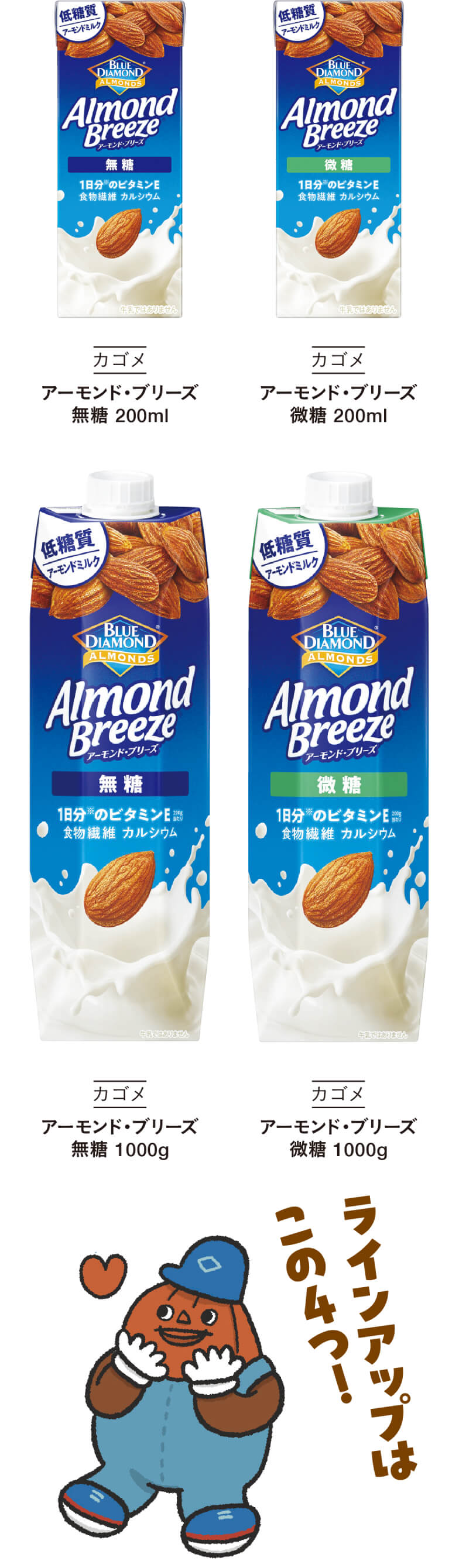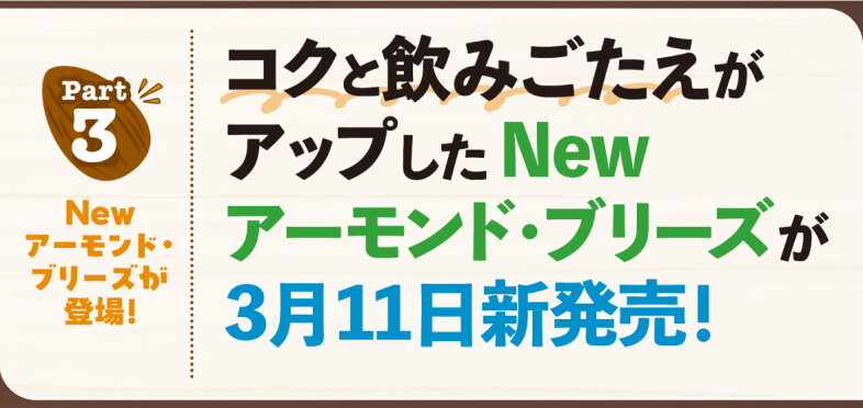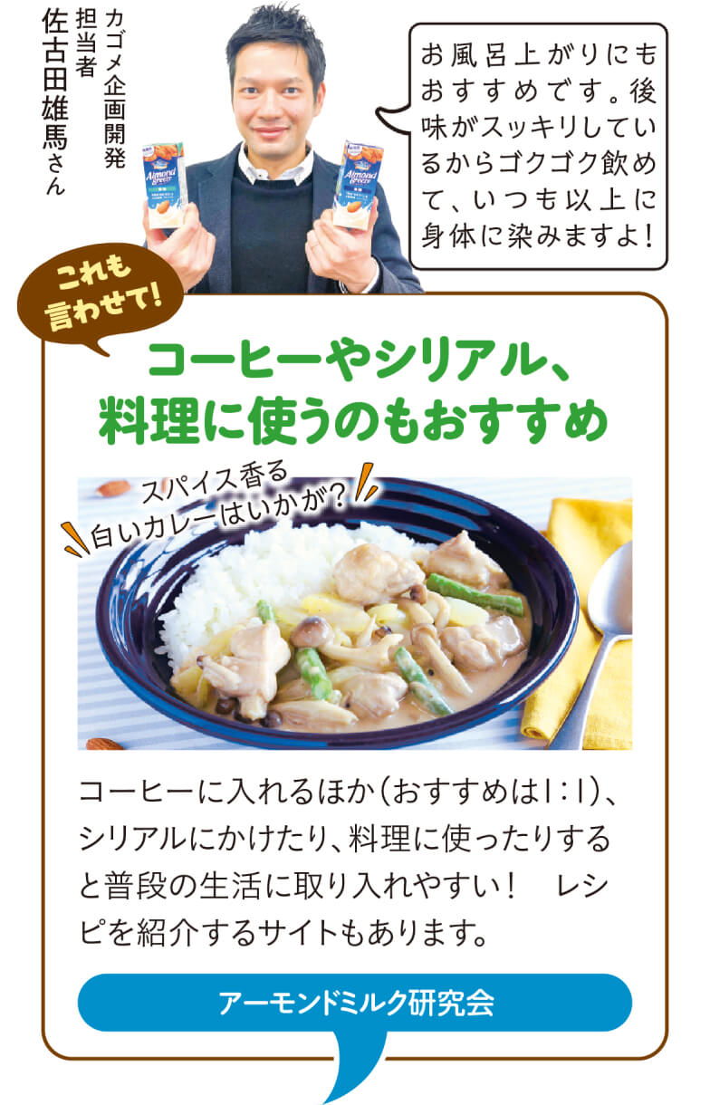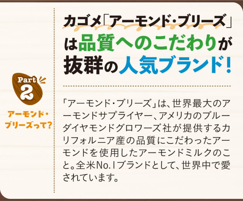 新しく発売される「アーモンド・ブリーズ」は、アーモンドの香りやまろやかなコクがありながら、後味はスッキリして飲みやすいのが特長。1日分のビタミンE※1はもちろん、食物繊維やカルシウムが手軽に摂れるうえ、低糖質※2なので毎日飲み続けても身体にやさしい。イキイキと過ごしたいみなさまにぴったりです!