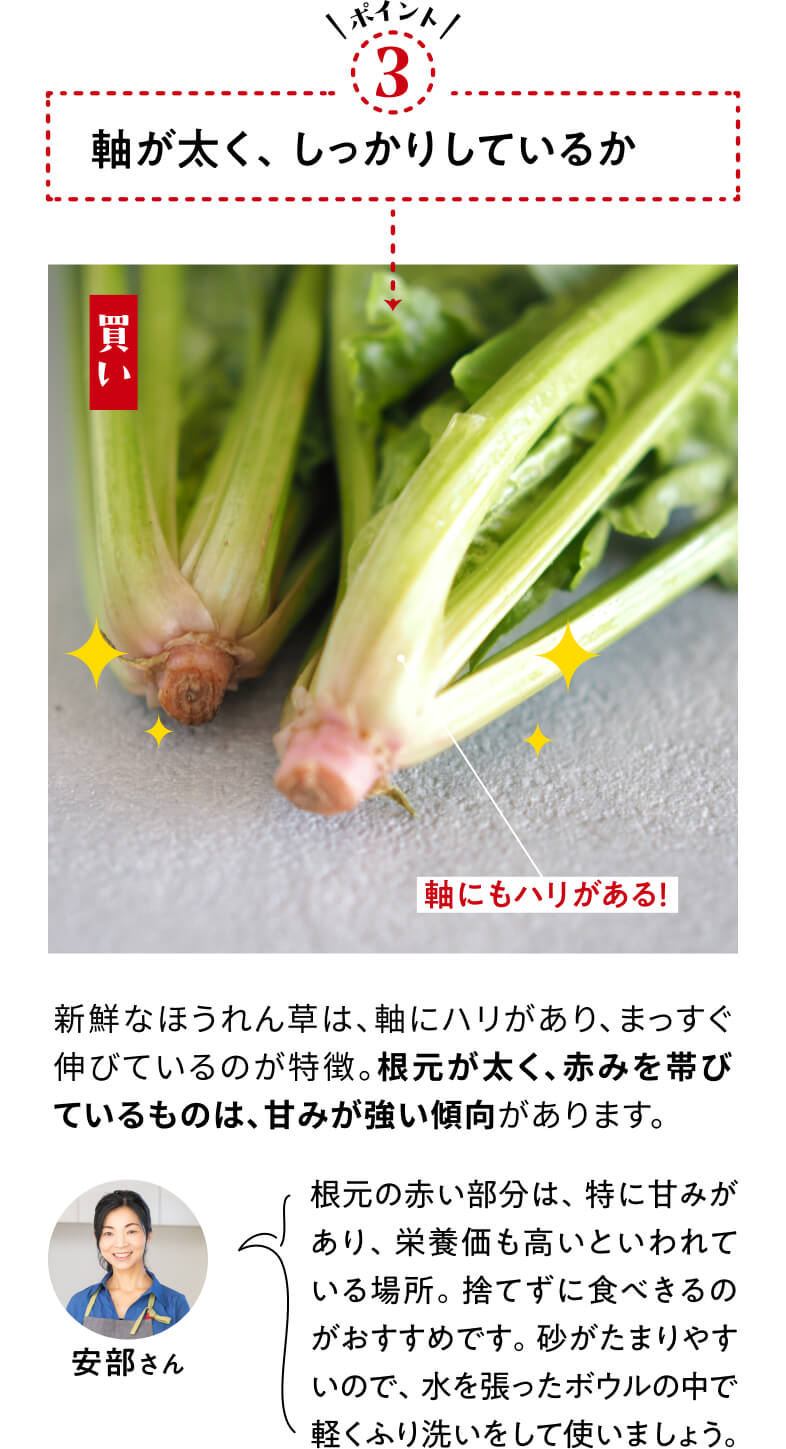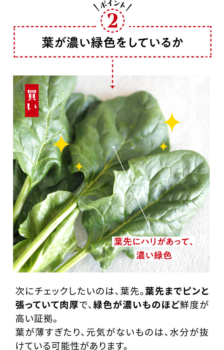 産地や気候によっても差はありますが、ほうれん草が旬を迎えるのは11~2月頃。この時期になると、あえて寒い中で露地栽培をした「縮みほうれん草」が店頭に並ぶことも。縮みほうれん草は通常のほうれん草よりも甘みが強く、しっかりとした歯ごたえが特徴。見かけたらぜひ、食べ比べてみてください。