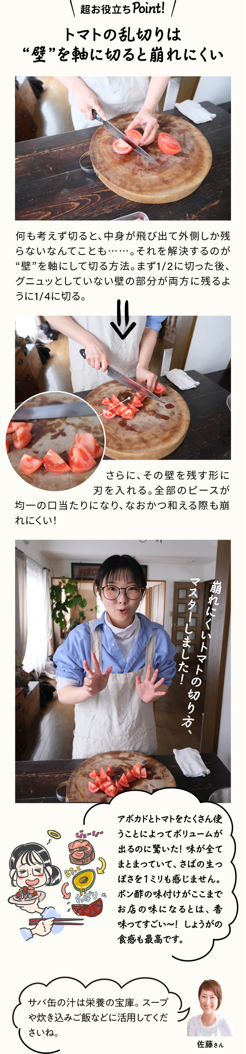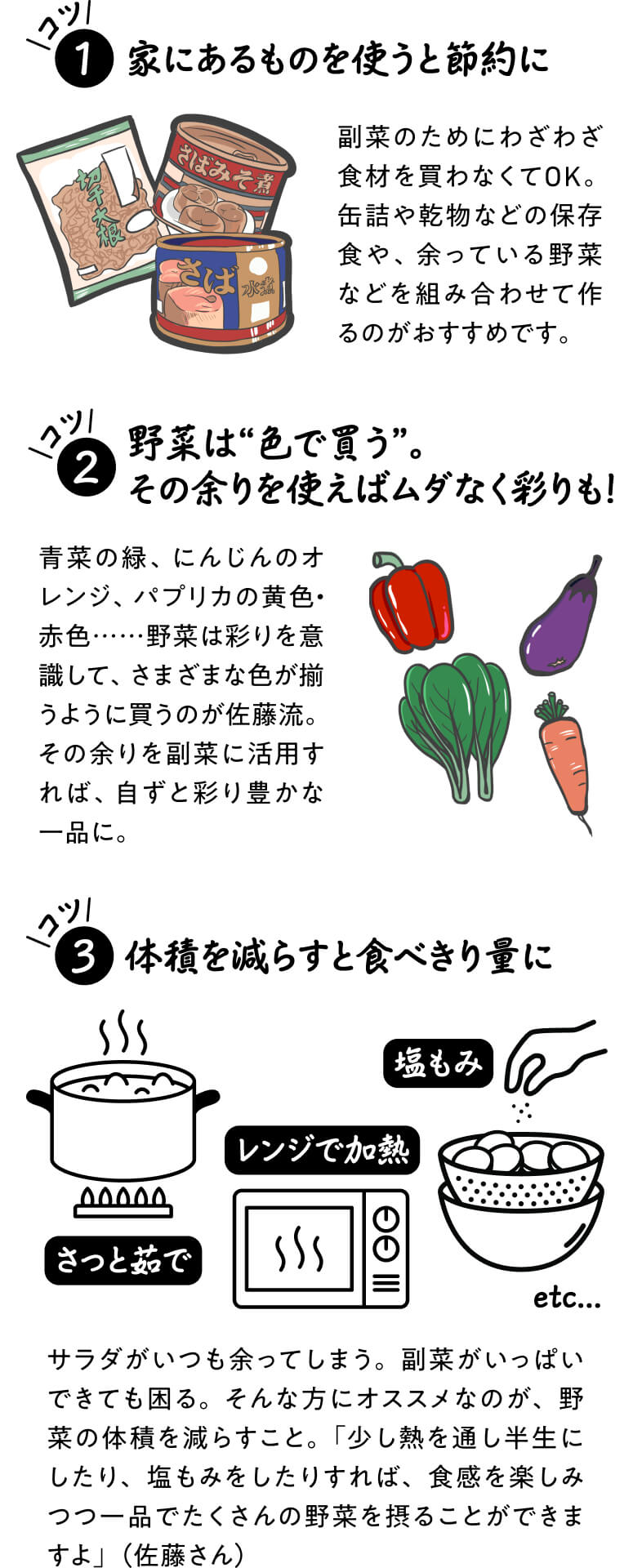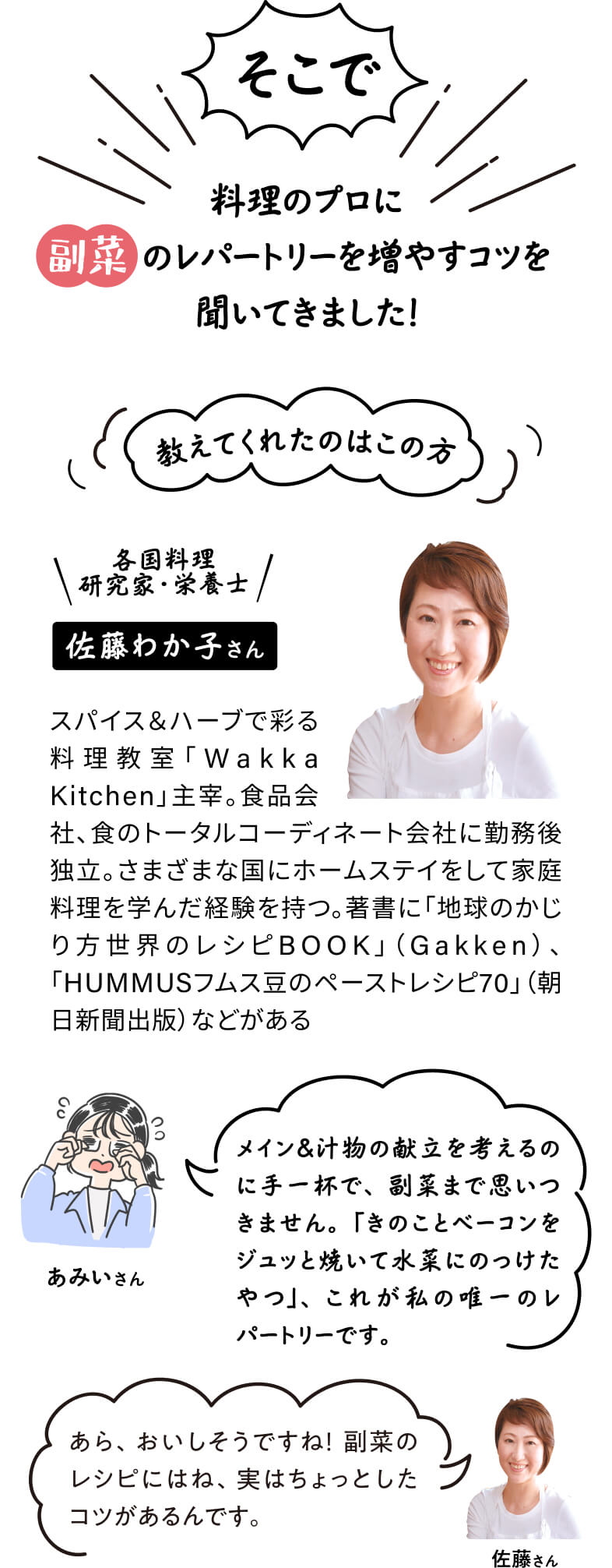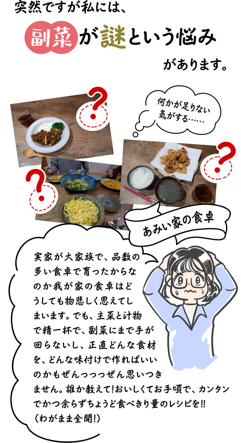 今日の献立は何にしようかな、そう考えたときにメインや汁物は思いついても、なかなかどうしても思い浮かばないのが「副菜」のメニューです。イラストレーターの藤田あみいさんもそんな悩みを持つひとり。「圧倒的にレパートリーがないんです。気づくと全部鶏がらスープの味になっていたり……」(あみいさん)。時短で節約にもなって、かつカンタンでおいしい副菜レパートリーをいっぱい手に入れたい! そんな一心で料理研究家・佐藤さんのお家を訪ねました。