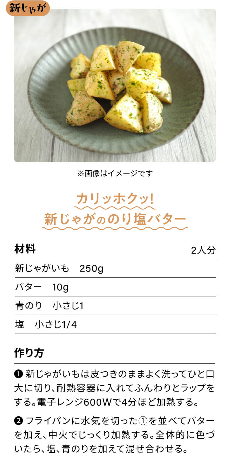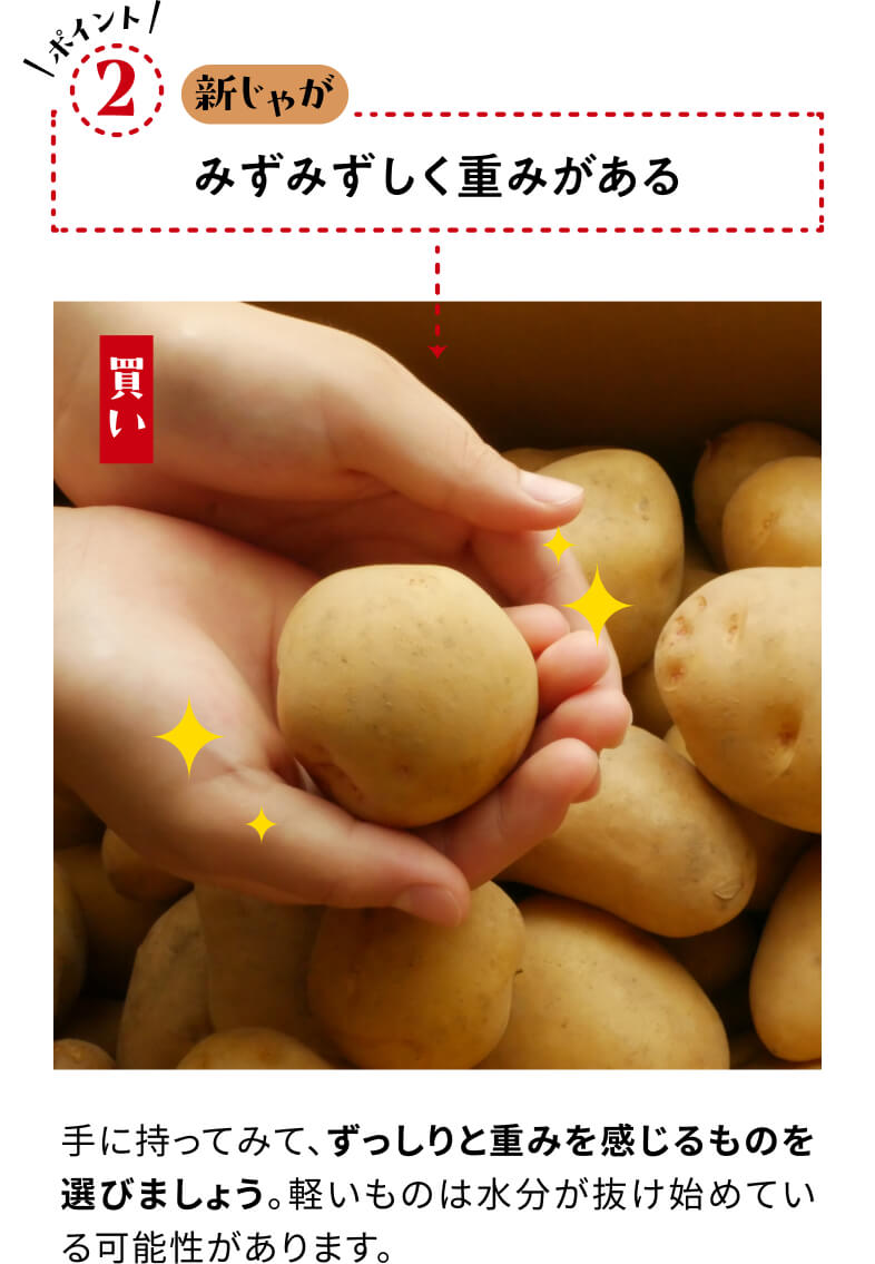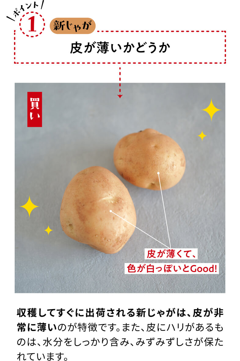 一般的にじゃがいもは収穫後に貯蔵されてから出荷され、一年を通して店頭に並びますが、春先には、収穫後すぐに出荷される新じゃがが出回ります。新じゃがは水分量が多く皮が薄めで傷みやすいため、早めに食べるのがおすすめです。