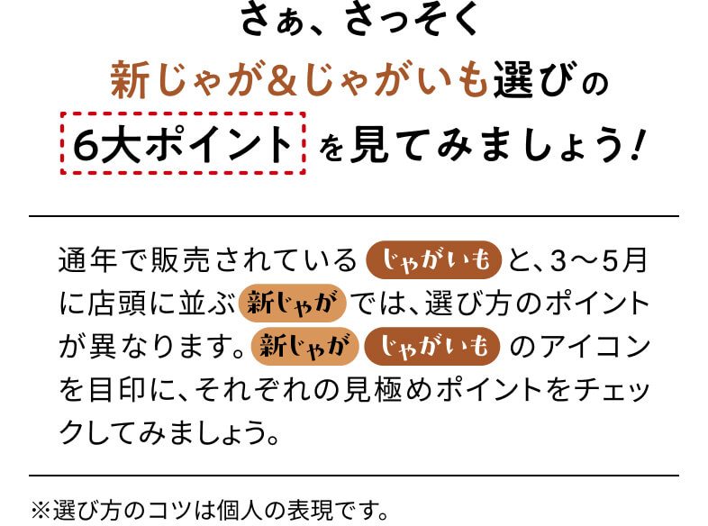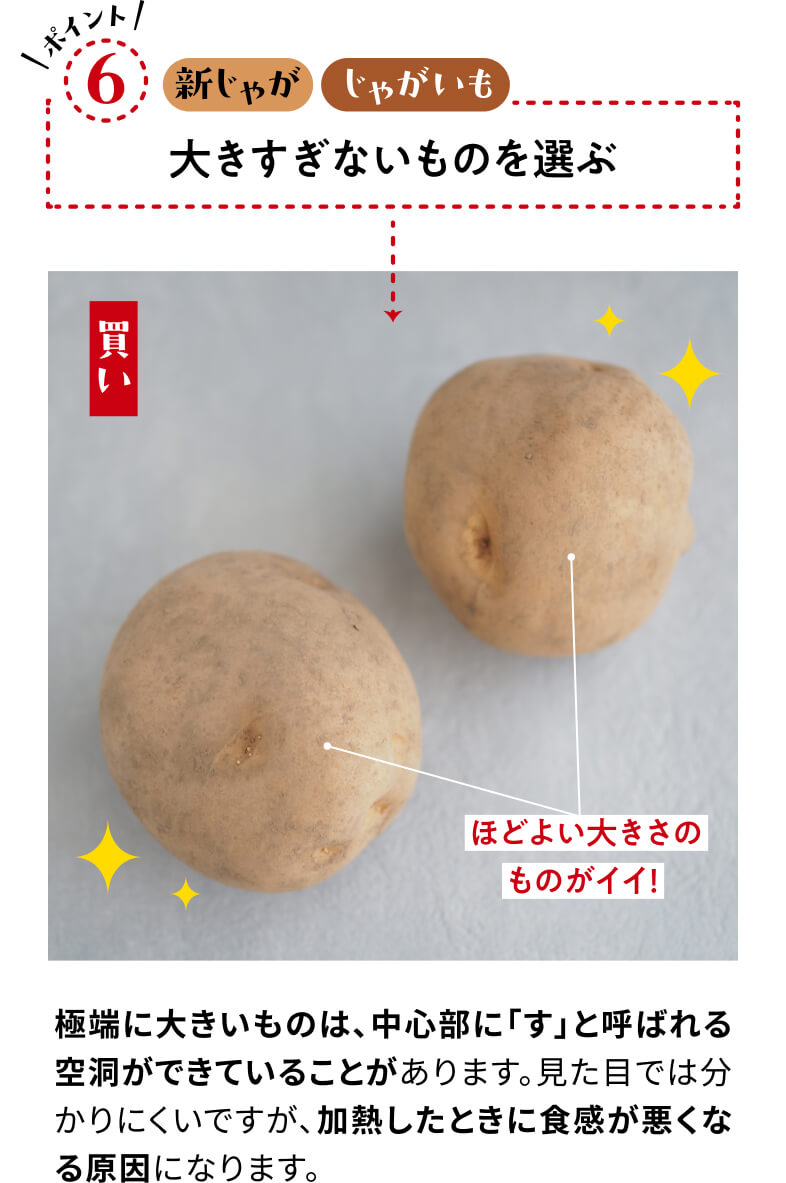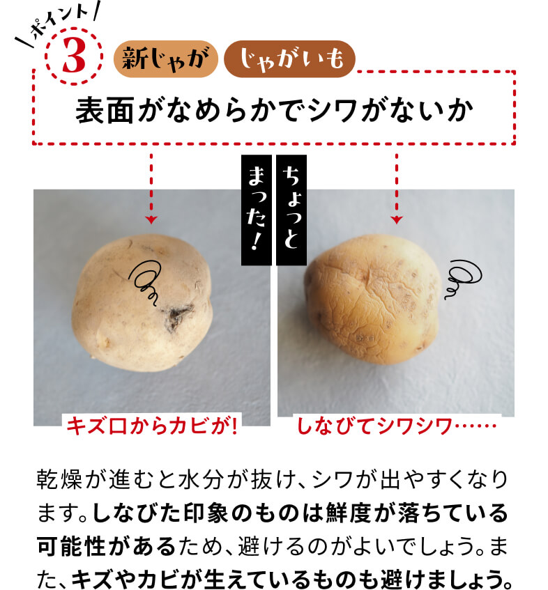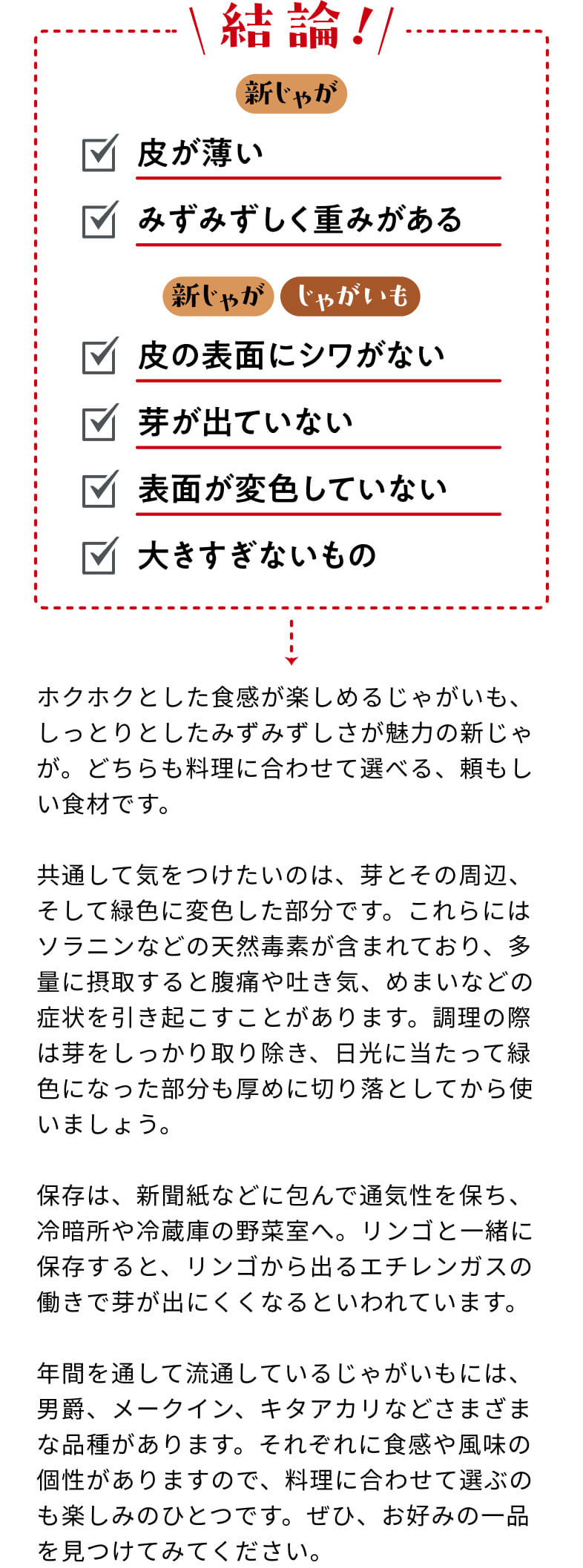 一般的にじゃがいもは収穫後に貯蔵されてから出荷され、一年を通して店頭に並びますが、春先には、収穫後すぐに出荷される新じゃがが出回ります。新じゃがは水分量が多く皮が薄めで傷みやすいため、早めに食べるのがおすすめです。