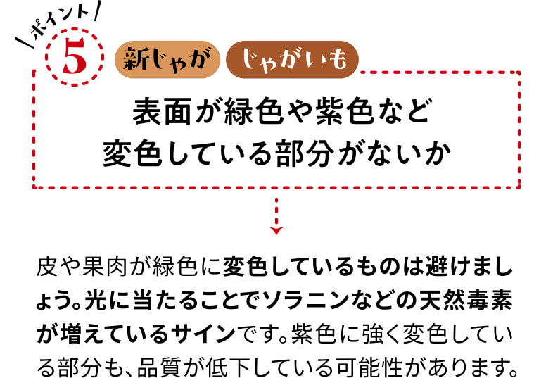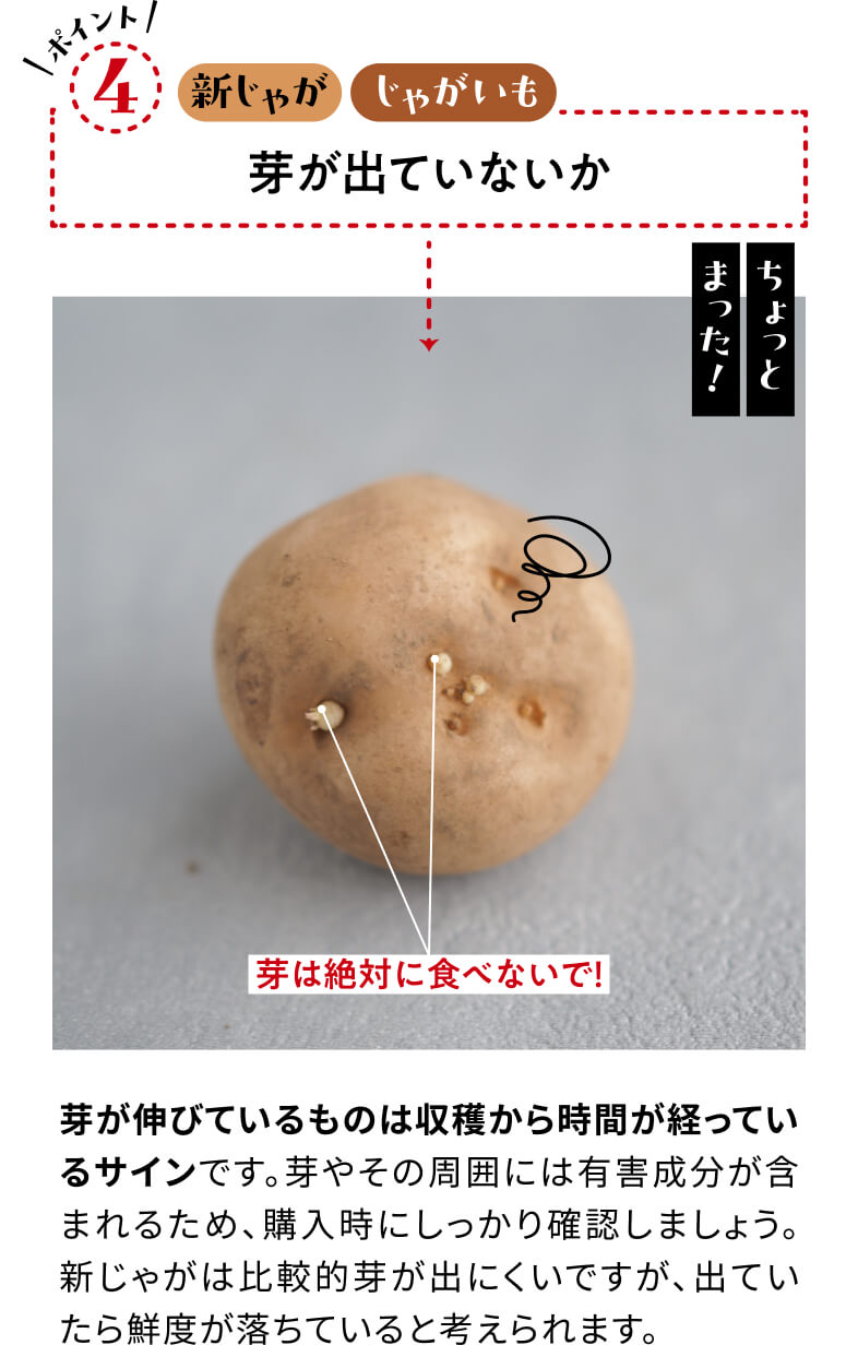 意外かもしれませんが、じゃがいもは、さつまいもとは違って「根」ではなく「茎(地下茎)」を食べる野菜なんです。そのため、日光にあたると緑色になったり、芽が出たりすることがあります。