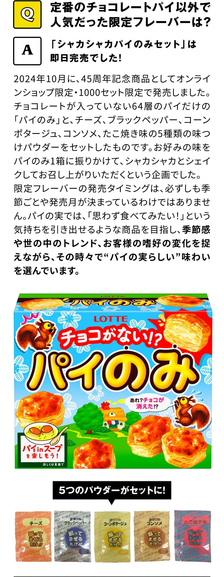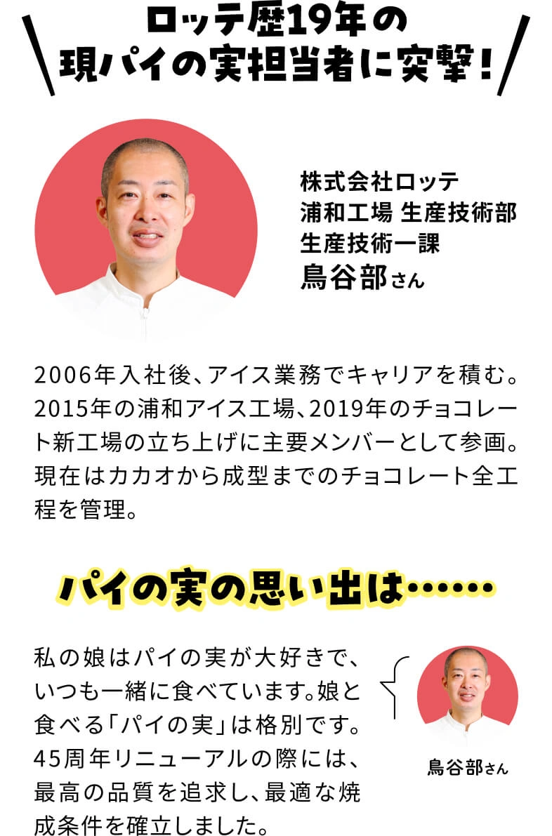 カリッとした表面をかじるとサクサクのパイ生地がふんわりと広がって、中からまろやかなチョコレートが織りなす、絶妙なバランスのおいしさと、焼きたてパイの香りが鼻から抜けていく「パイの実」は、食べ始めたら止まりません! どうしてこんなにサクサクなの? いつ食べても、 焼きたてパイの香りがするのはなぜ? その秘密を探るべく、株式会社ロッテの浦和工場にお邪魔しました。