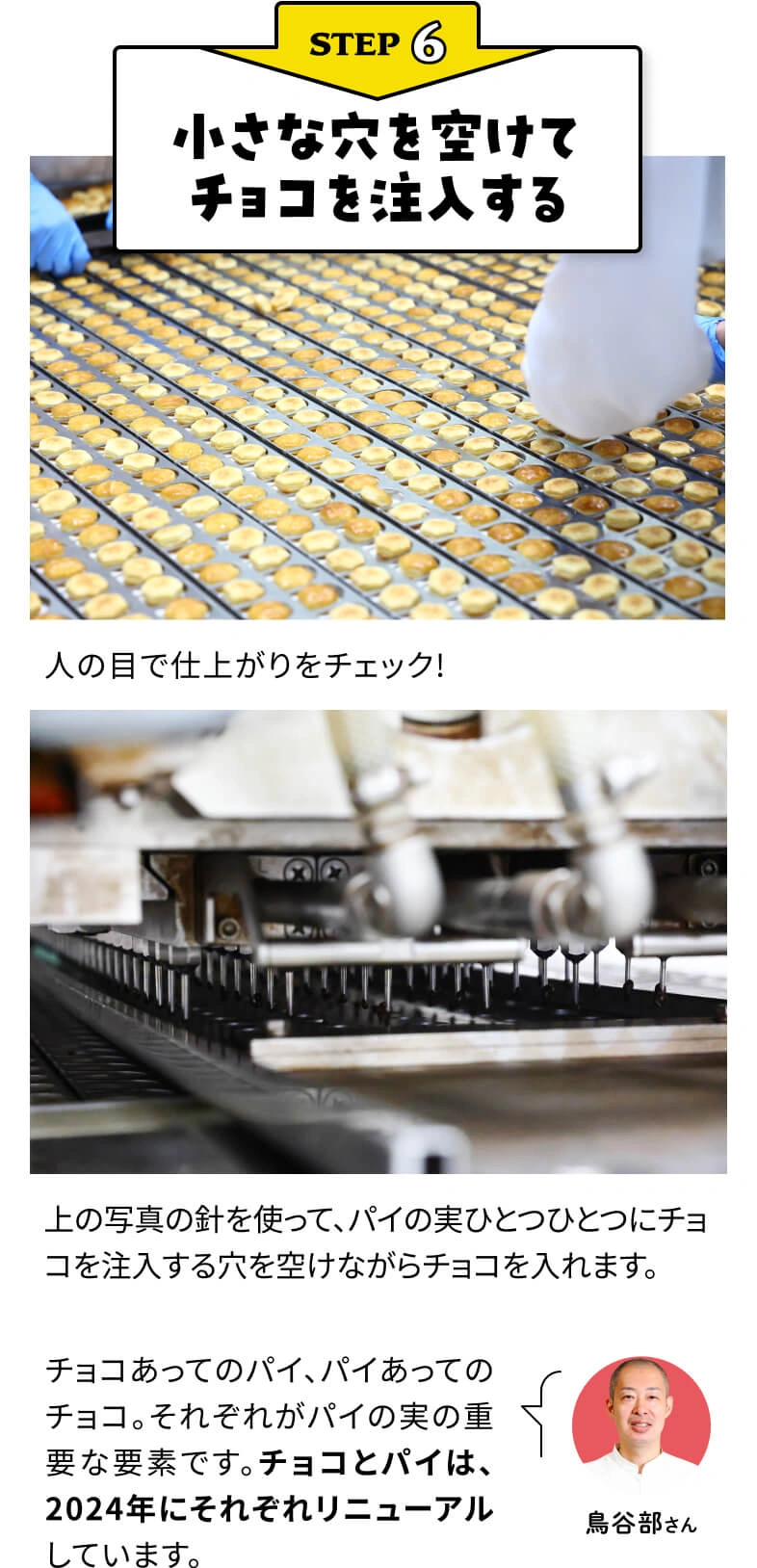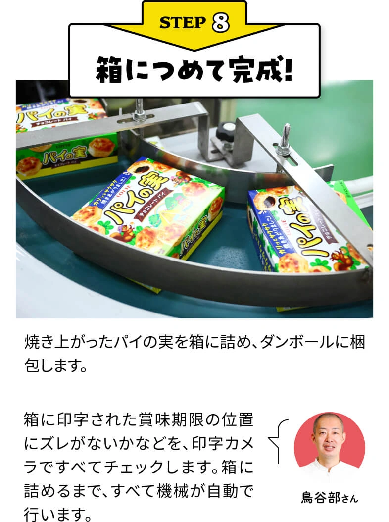 パイの実の箱を開けたときにフワッと立ち上る焼きたてパイの香りや、外はカリッ、中はサクサクの食感、まろやかなチョコレートのおいしさの秘密がよくわかりました! 生地を折って伸ばして、をたくさん繰り返すなど、パイの実ってすごく丁寧に作られているんですね。食べる人のことを考えたきめ細やかな心遣いがあって、日本が世界に誇るべき技術だと思います!