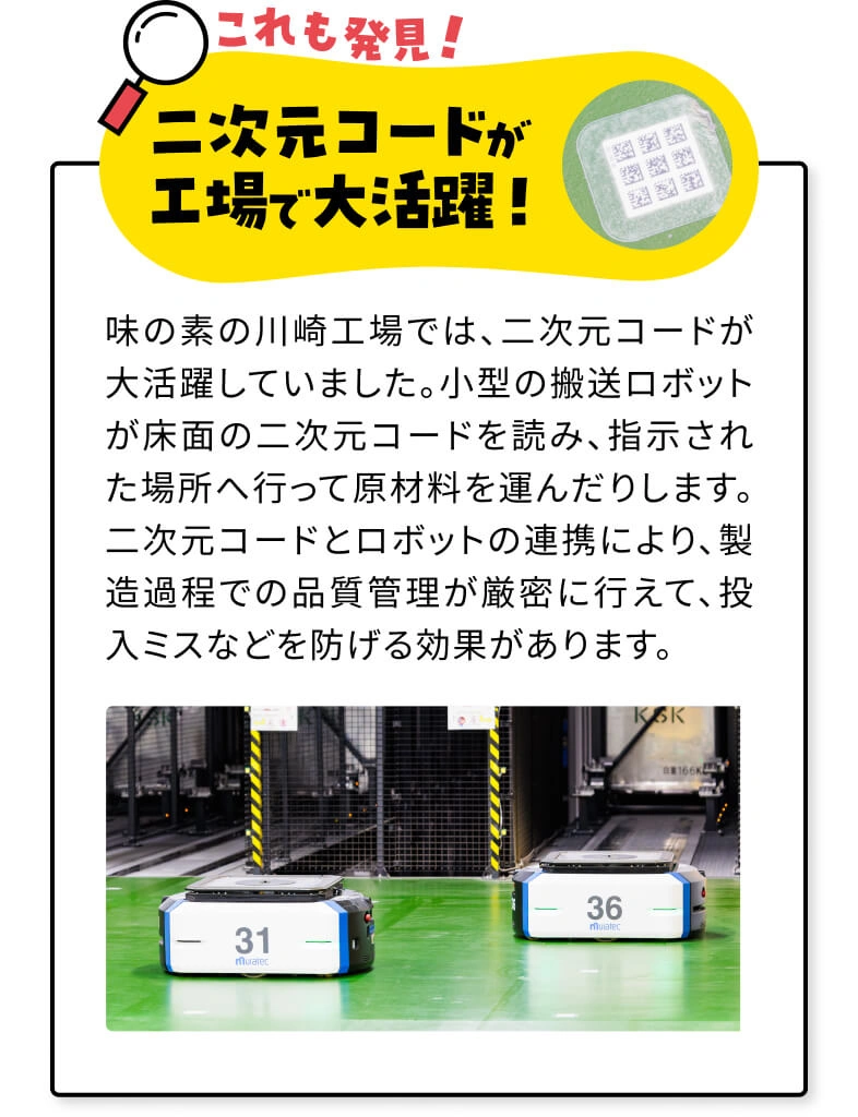 川崎工場の中は、『クノール®️カップスープ』の幸せな香りでいっぱい!金属などを検出するX線装置が至るところにあり、安全性が担保されているのだなと感動しました。また、『クノール®️カップスープ』の溶けやすさのヒミツは、練り上げた顆粒の大きさにあることもわかって勉強になりました。二次元コードを読み取って正確に動くロボットにもびっくり!『クノール®️カップスープ』のおいしさのヒミツは、味の素や工場のみなさまの日々の努力の結晶でした!