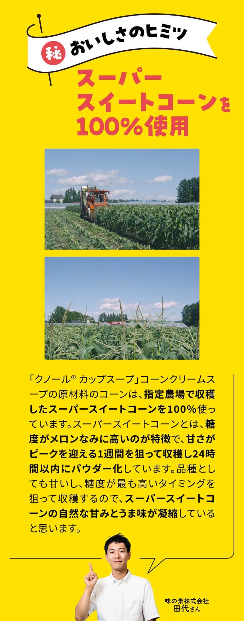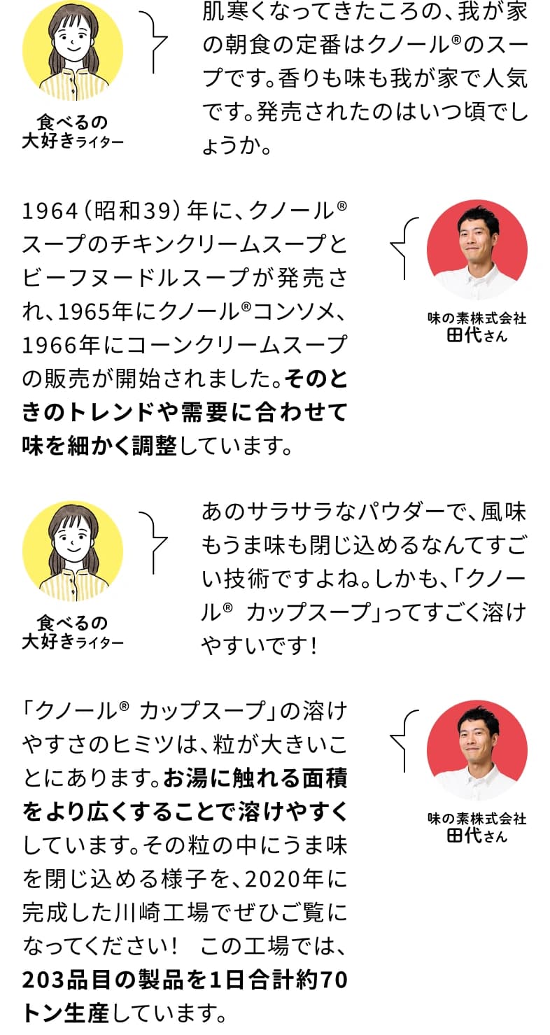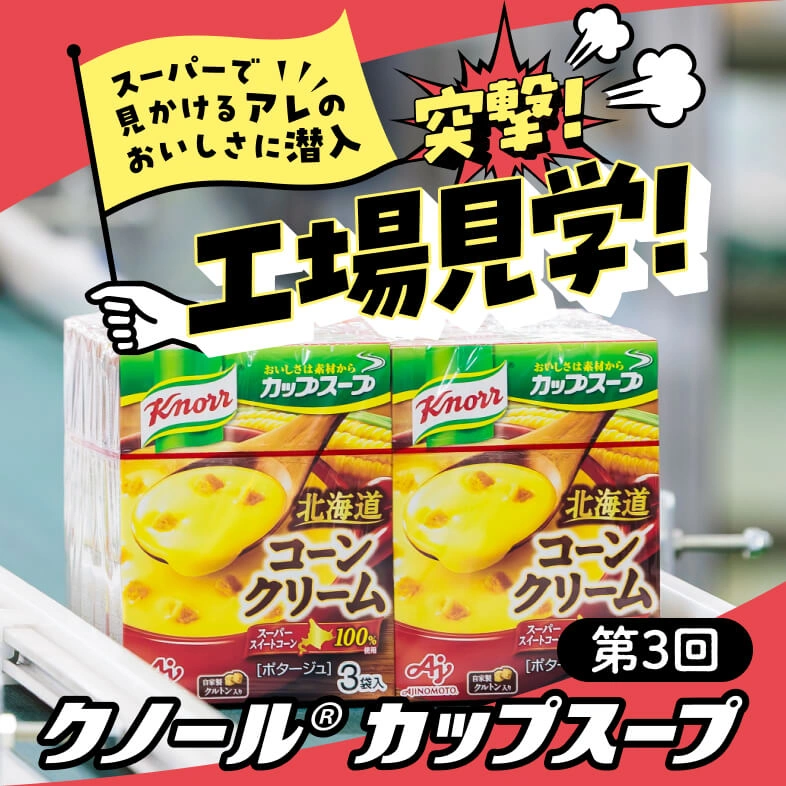 お湯で溶くだけで、コーンの甘みとクルトンのカリカリ感が楽しめる、クリームたっぷりのコーンクリームスープといえば『クノール®️カップスープ』!このクリーミーさとコーンの甘みはどのように作られているのでしょう?そのヒミツに迫るべく、味の素の『川崎工場』に潜入しました!