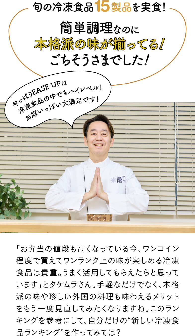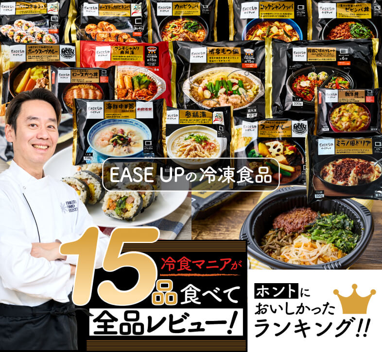 年々、おいしさがレベルアップしている冷凍食品。中でも「EASE UP(イーズアップ)」シリーズは、人気の飲食店とコラボするなど、冷凍食品のイメージを覆すような本格派のおいしさが魅力です。そこで今回は、はとぼん編集部が2026年2月~3月現在で発売中の15品をピックアップ! 冷凍食品マイスターのタケムラダイさんにぜ~んぶ実食してもらい、「おいしさ」、「ボリューム感」、「調理のしやすさ」の3つのポイントで食べ比べてもらいました!